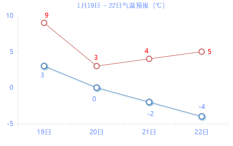 目前北方有一股较强冷空气正在东移南下,受其影响,明天(1月19日)中午起我市气温明显下降,48小时最低气温降幅可达6~8℃,并伴有陆上阵风5~7级、水面8级的偏北大风。21-23早晨最低气温零下2~零下4℃,有冰冻。