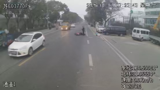1月17日清晨7点22分左右,苏州公交集团吴江公司742路驾驶员孟元果,驾驶苏E03770F公交车行驶在往常的上班路上,刚转过一个路口,就看到前方非机动车道上有人连车带人摔倒在路中间,情况看起来有些危急。
