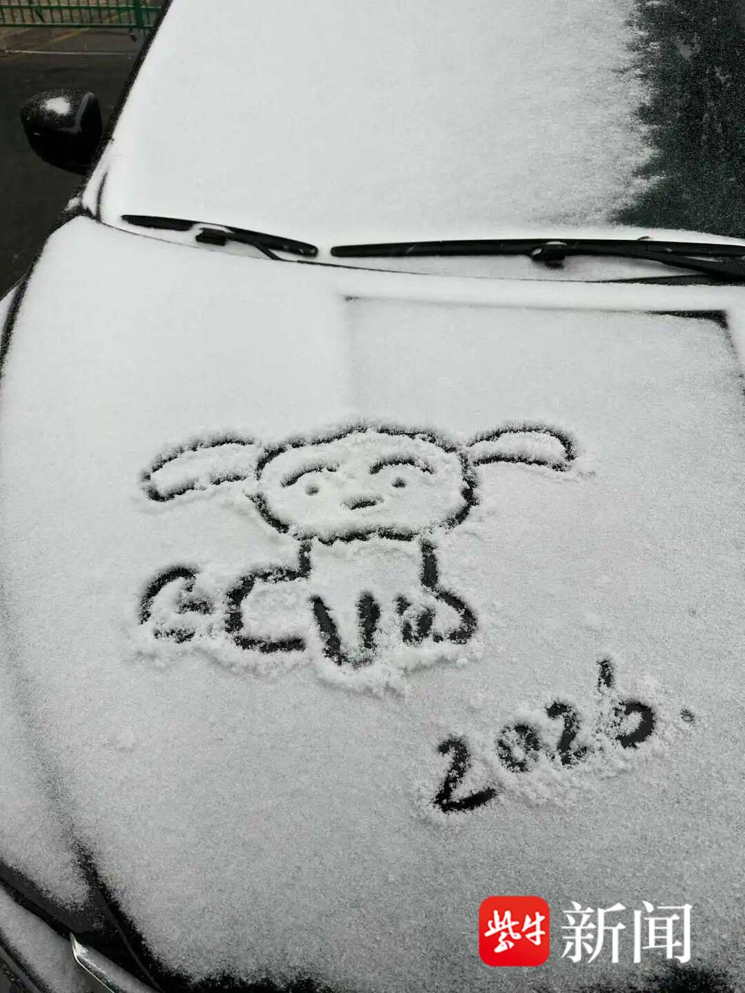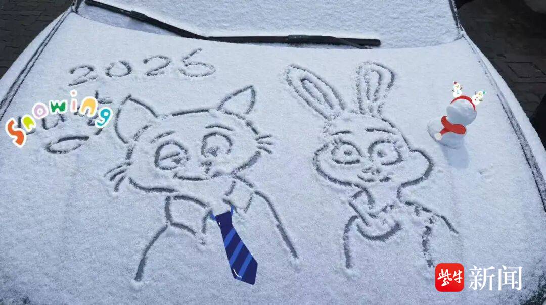 在被清理过的街道之外,一场涂鸦大赛悄然展开。汽车引擎盖上、路边围栏旁,一场即兴的“雪地涂鸦”开始出现。有人在车盖上画下一个笑脸,给2026年的第一场雪留个记号;有人用手指勾勒出小动物的轮廓,让冷白的雪面多了几分生动;孩子蹲在路边,小心翼翼地写下年份,掌心沾满雪花,却舍不得拍掉。