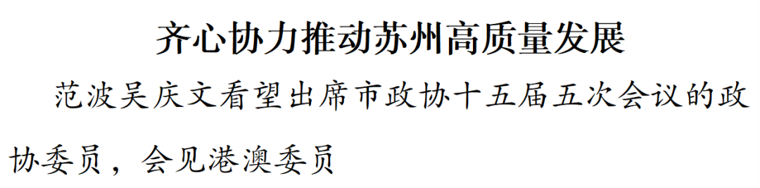 在会见港澳委员时,范波、吴庆文向大家给予苏州发展的关心支持表示感谢,希望各位港澳委员继续发扬爱国爱港爱澳优良传统,全面准确、坚定不移贯彻“一国两制”方针,积极宣传苏州、推介苏州,带动更多港澳同胞特别是青年一代来苏州创新创业、投资兴业,推动苏州与港澳合作迈上新台阶,更好服务全国全省发展大局。港澳委员们充分肯定苏州发展取得的成绩,表示将始终心系家乡,认真履职尽责,积极建言献策,当好桥梁纽带,努力为苏州现代化建设贡献更多智慧力量。