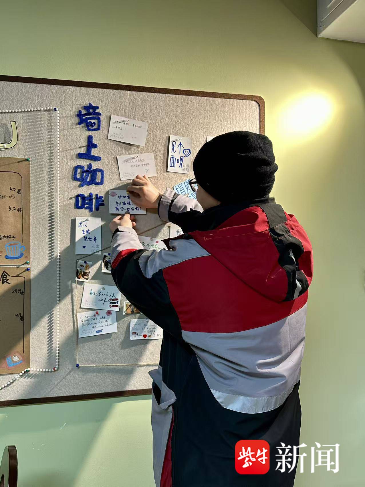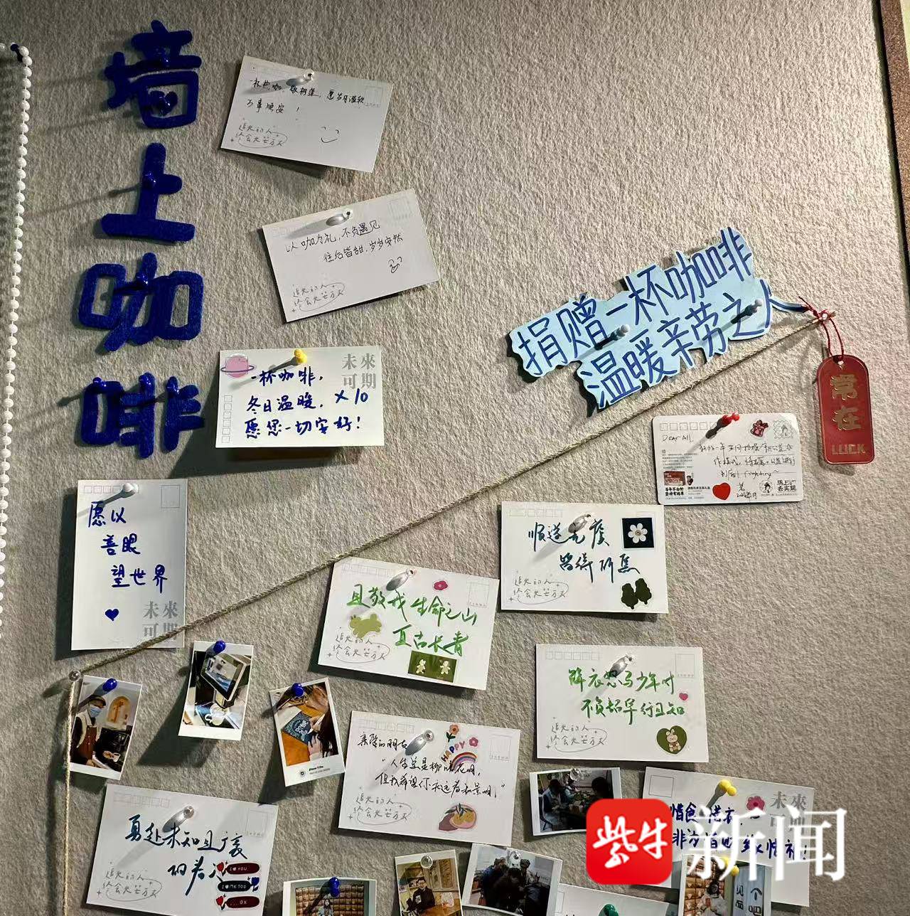 下午两点,扬子晚报/紫牛新闻记者在地铁通道转角处发现了这家名为“见个面呗”的简易咖啡站。一张原木色小桌、两把折叠椅、一套手冲器具,构成了龚师傅的小天地。店铺虽小,却布置得格外温馨。最引人注目的是右侧的“温暖墙”,深色软木板上贴满了五彩缤纷的爱心贺卡,每一张都写满陌生人的暖心祝福。墙上醒目的手写标语尤为动人:“捐赠一杯咖啡,温暖辛劳之人。”