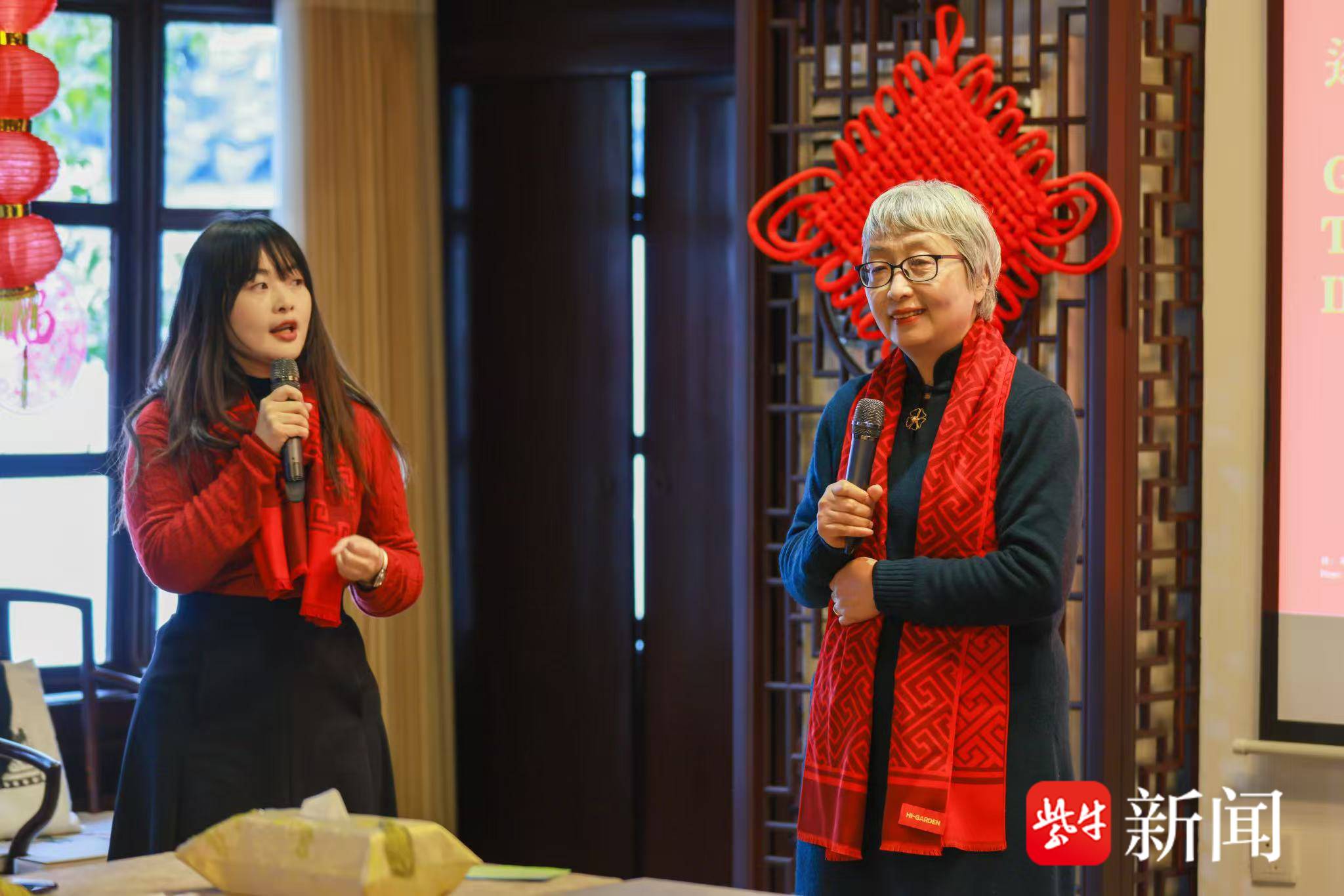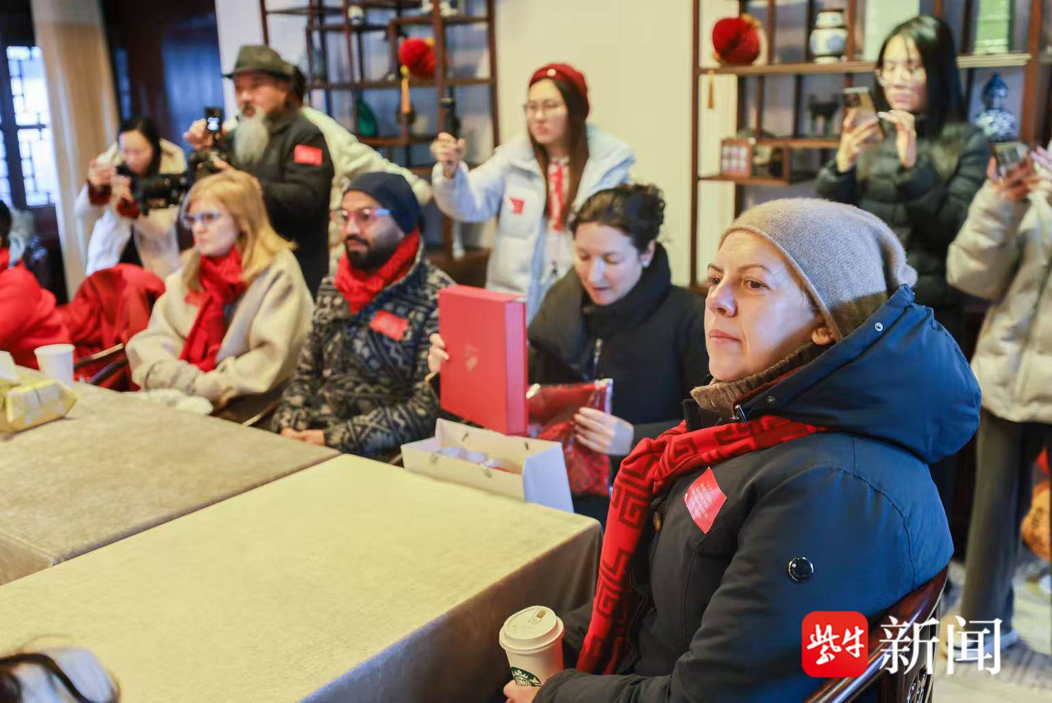 伴随这份别致的礼物,苏州博物馆研究馆员、中国民俗专家沈建东为外宾们讲解了春节的历史渊源与地方特色,尤其是苏州本地“写春联、剪窗花、挂灯笼”等传统习俗。随后,沈建东还介绍了“苏灯”这一非遗技艺,现场教唱苏州童谣,外宾们饶有兴致地模仿着吴语发音,在轻松愉快的韵律中触摸苏州文化的古老脉搏。