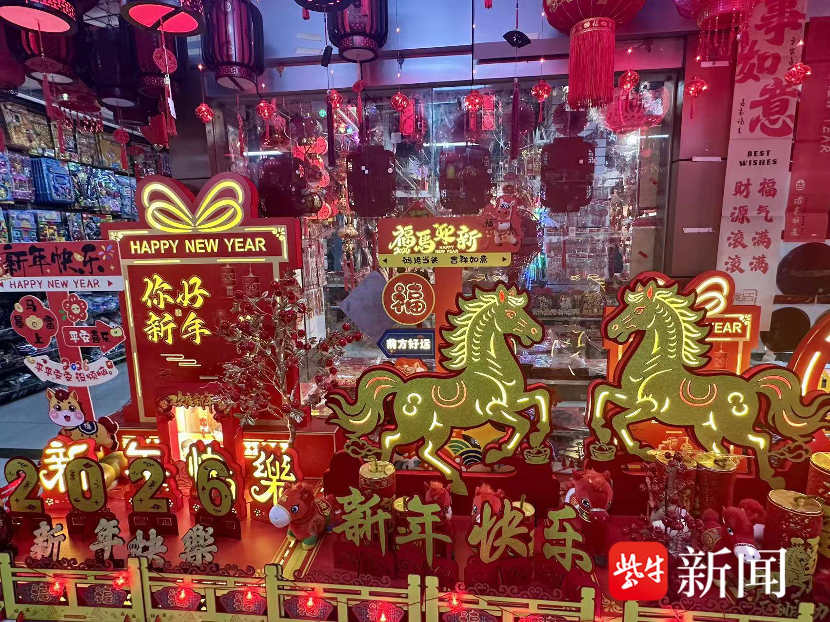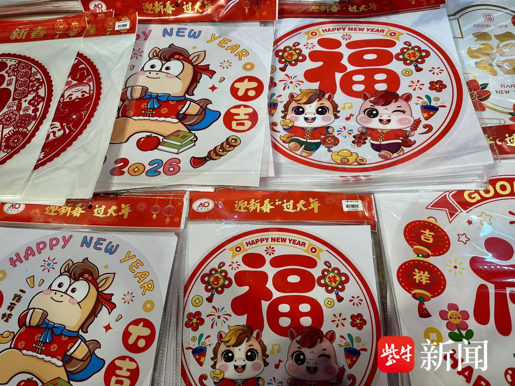 在苏州钱万里桥小商品市场,红彤彤的年饰铺天盖地,其中各式马元素新品格外醒目,被商家摆在最显眼的“C位”。市场内一家不足20平方米的小店里,店主正忙着给顾客打包春联。“从1月22日左右,生意就明显热起来了,今年马年主题的货特别受欢迎。”他指着货架上琳琅满目的产品说道,“马年新品特别多,不光是带小马的福字,还有立体马形挂饰、马年生肖窗花等,卖得都很不错。”