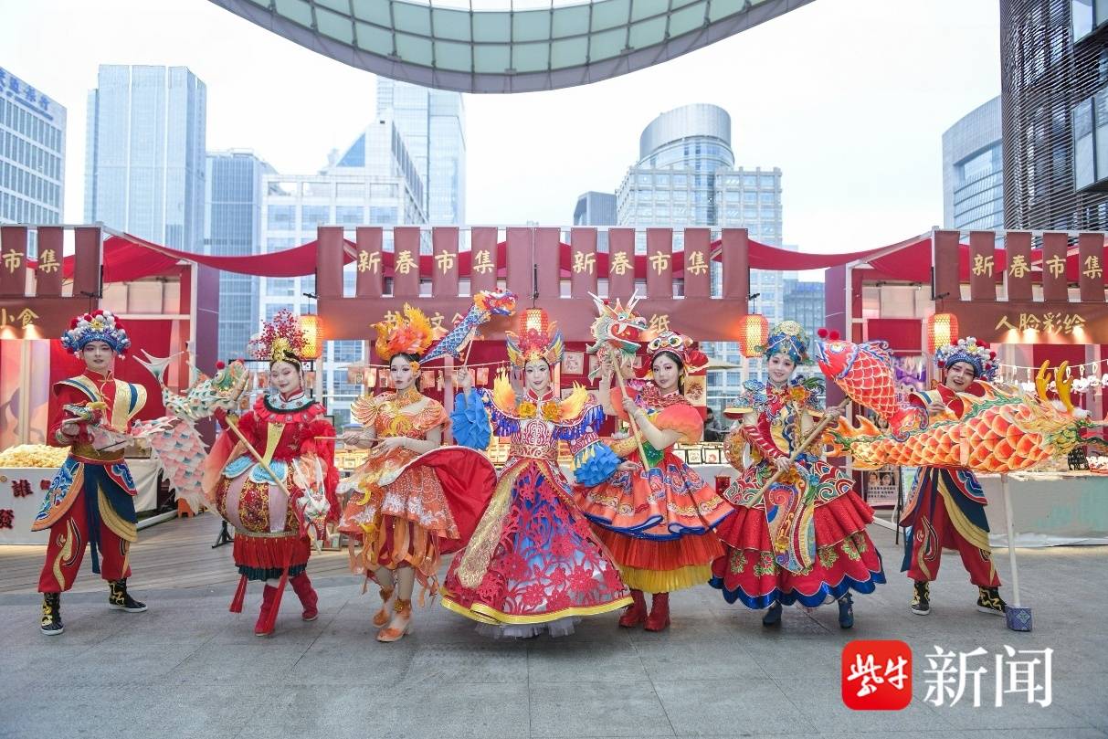 “非遗灯韵”定点表演将剪纸、年画、风筝等八种非遗元素幻化于华服与灯彩,上演流动的光影剧场;大年初一的舞龙舞狮及高桩表演,开启金龙醒狮贺新岁的开年好戏;而位于三楼凤园的新春市集集结龙须糖、宋锦、古法香膏等传统美食与雅致文创,更有财神派红包、元宵猜灯谜等环节。新春市集一直延续到元宵节,重现熙攘繁华的姑苏年节盛景。