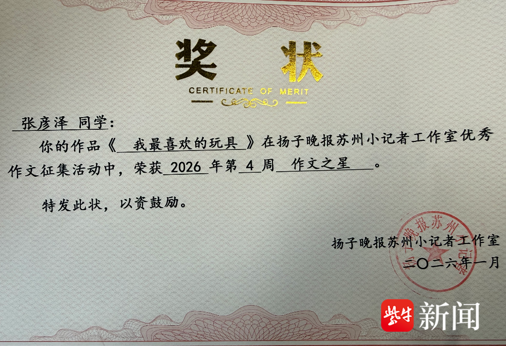 近日,苏州市沧浪新城第一实验小学二(5)班张彦泽同学凭借作文《我最喜欢的玩具》,被评为2026年第四周“作文之星”。这篇作品以心爱的玩具变形金刚擎天柱为描写对象,将它的外形、配色、武器与可变形的特点一一呈现,勾勒出一个威武帅气、充满力量的机器人形象。文章不仅细致展现了玩具的形态与趣味,更在对角色守护地球、伸张正义的叙述中,寄托了小作者对英雄的向往与崇敬,字里行间满是真挚的喜爱。