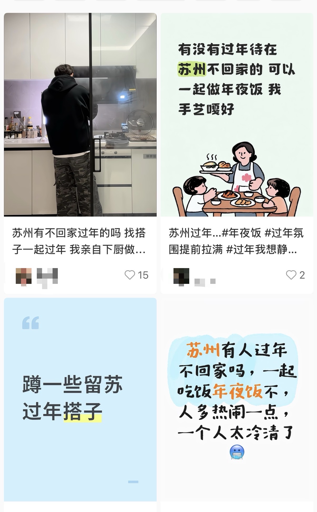 除了老一辈市民,不少留苏过年的年轻人,也选择以自己的方式坚守“年夜饭仪式感”——找同乡、同事搭伴,一起动手做一顿团圆饭。28岁的安徽小伙小吴来苏州工作2年,今年春节选择留苏,他和另外3位留苏的网友约好,除夕当天一起搭伙做年夜饭。“以前在家都是爸妈做饭,今年不回去,就想着找朋友搭伴做饭,既能尝到家乡味,也能一起聊天打游戏,不孤单。”