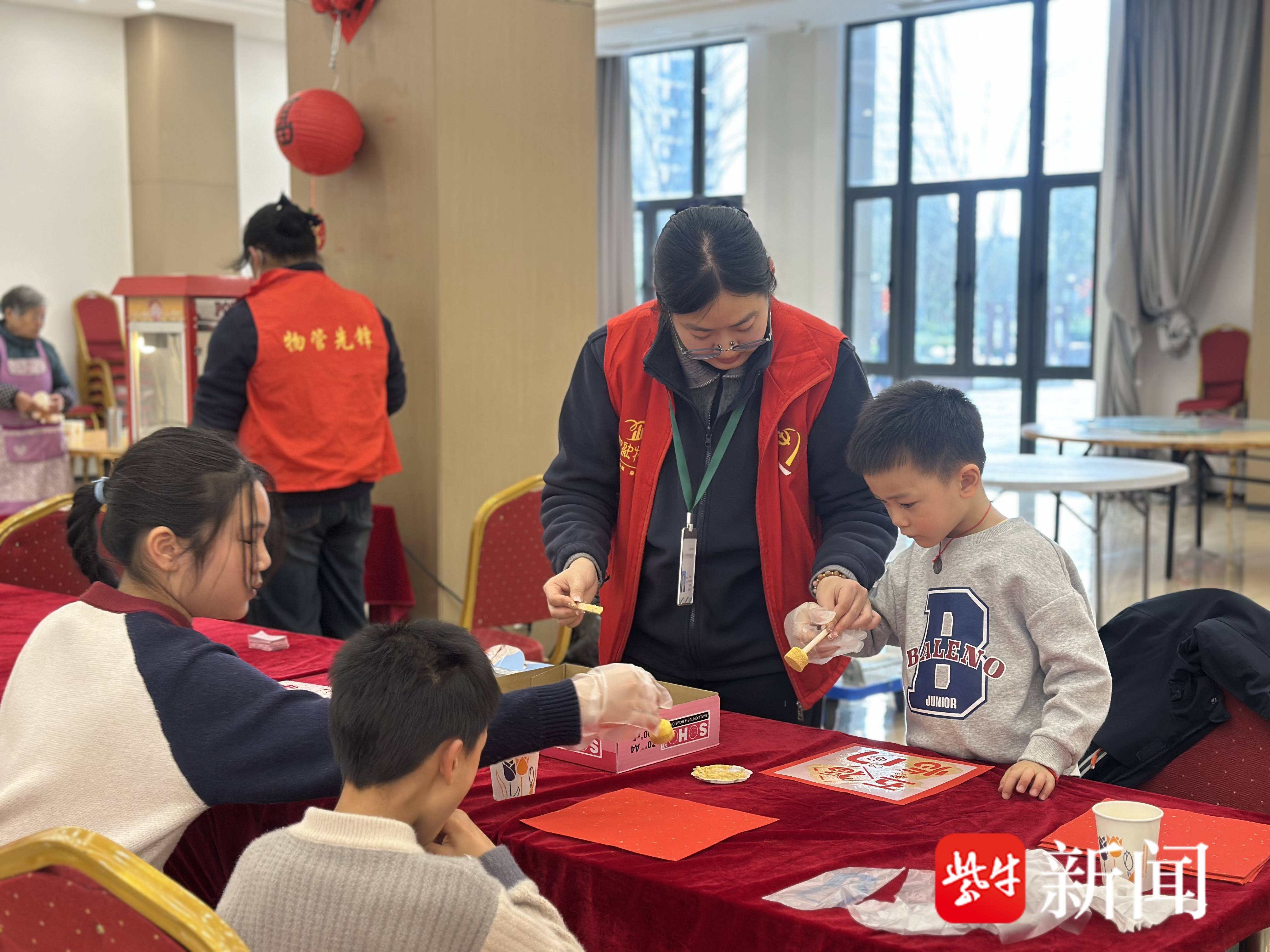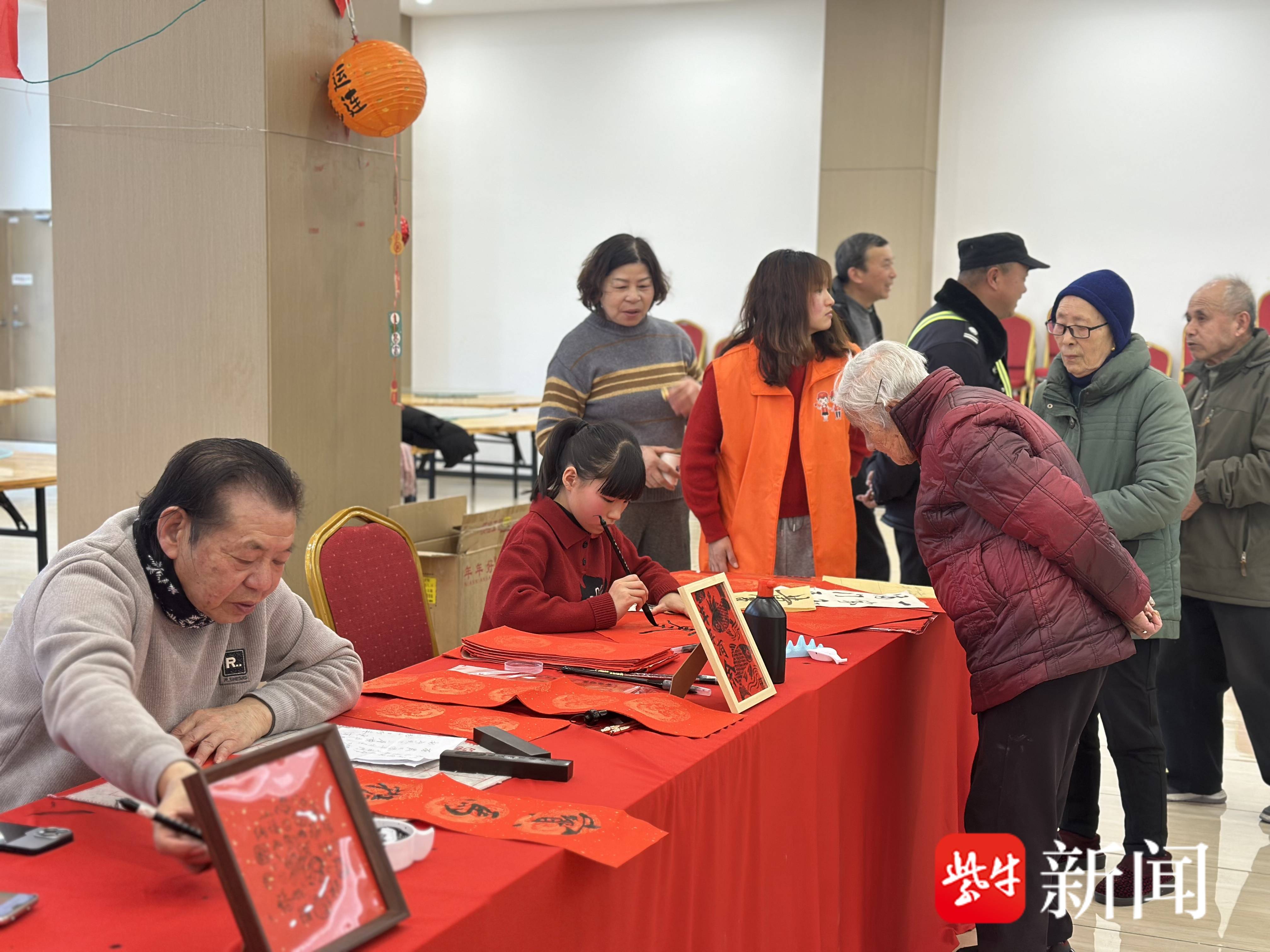 活动现场人头攒动,气氛热烈,处处洋溢着欢声笑语。在写春联区域,长桌铺开,墨香四溢。书法爱好者们铺纸研墨,笔走龙蛇。活动同时邀请了社区里的小朋友们参与其中。大手握小手,一撇一捺间,书写着对新年的美好祈愿。一副副寓意吉祥的春联和红火的“福”字,成了最受居民欢迎的“年货”。