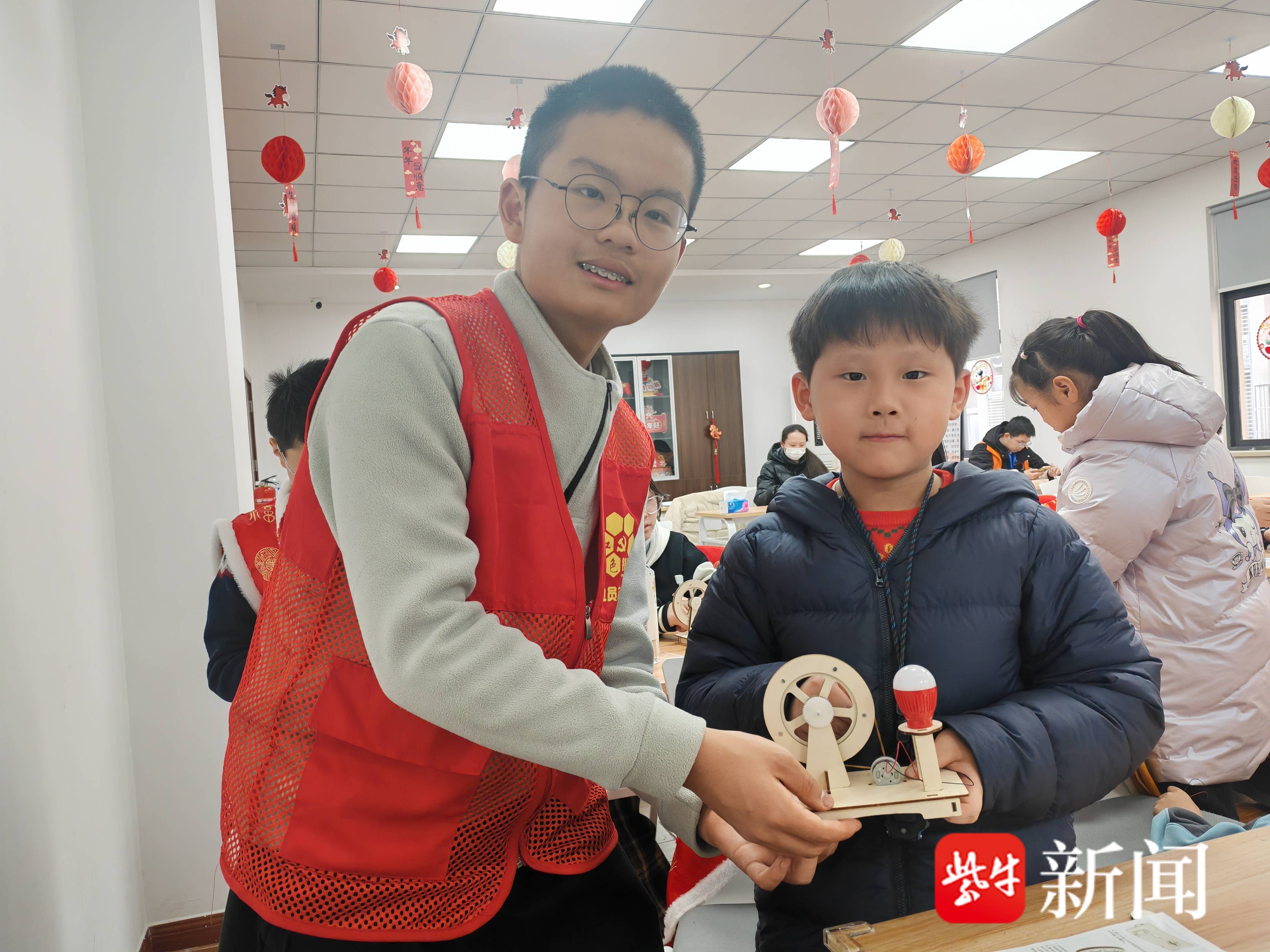 进入手工组装环节,志愿者进行一对一指导,孩子们认真拼接木板、安装齿轮、连接线路、固定摇柄。大家专注钻研、互帮互助,主动思考、反复调试,在试错与改进中完成拼装。当摇动手柄、小灯泡成功亮起的瞬间,孩子们脸上满是成就感与喜悦之情。