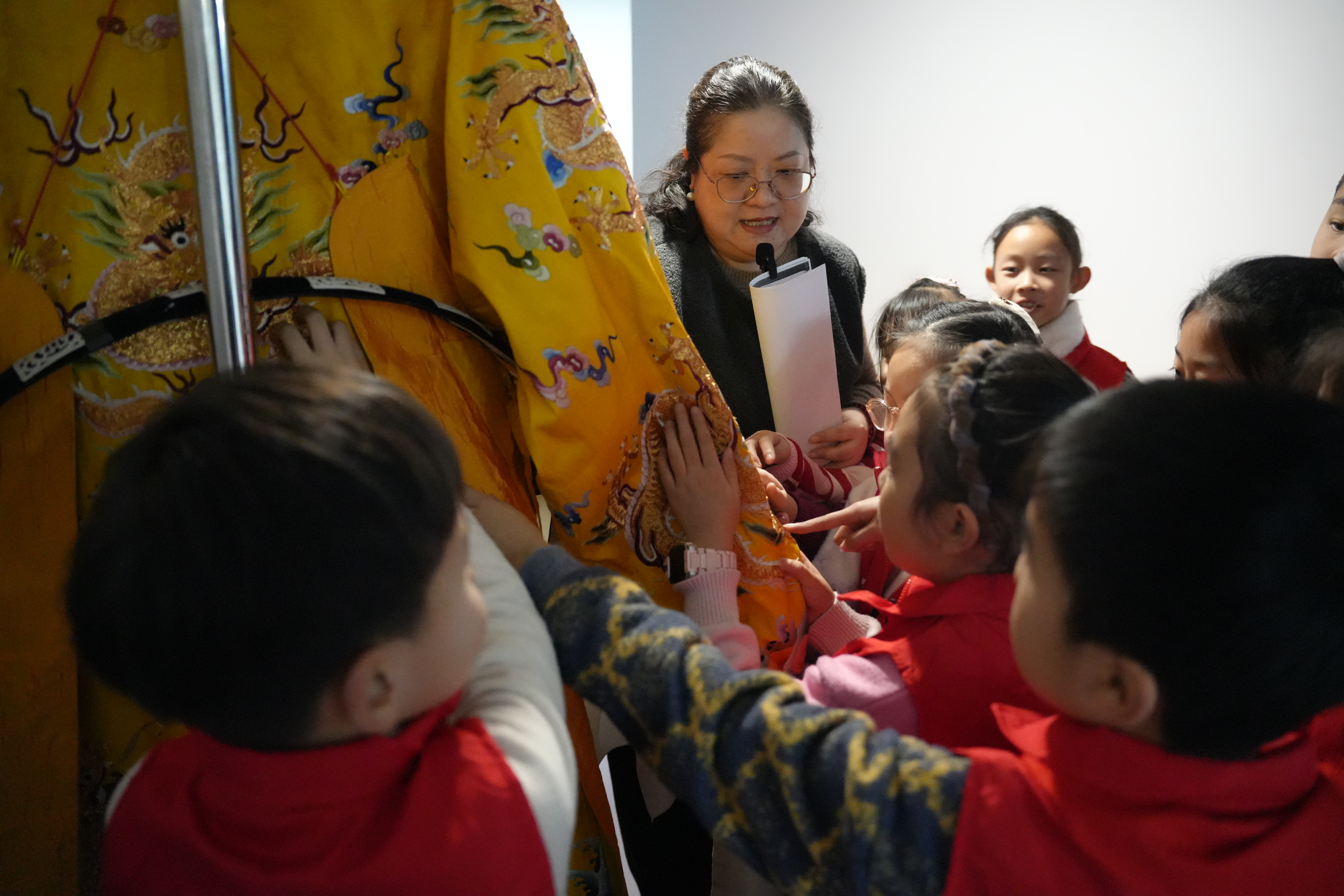 随后,小记者们来到戏服展示区。“大家不仅要睁大眼睛看,还可以伸出手来摸一摸。”杨柳老师话音刚落,孩子们便迫不及待围了上去。当指尖触碰到戏服上细腻的花纹时,大家纷纷发出惊叹:“老师,这些花纹真的是一针一线绣上去的吗?”杨柳老师笑着点头:“没错,每一件戏服都是工匠们的心血,比如这件白娘子的戏服,造价可不菲呢。”