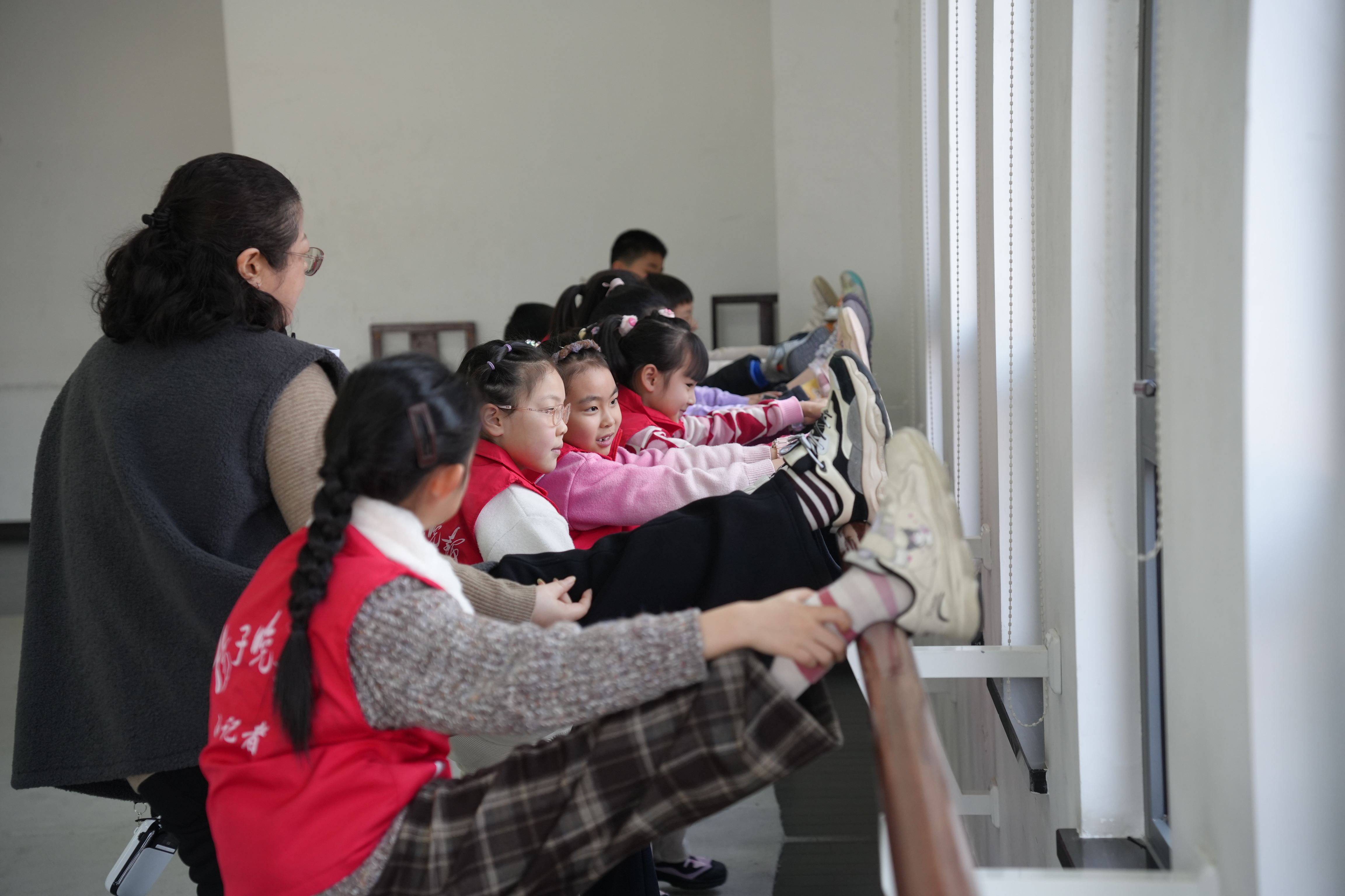 最让小记者们直呼“酸爽”的环节,莫过于体验基本功“压腿”。在排练厅,杨柳老师让孩子们模仿演员把腿放在杆子上拉伸。“哎哟,我的腿在抗议了!”一位小记者刚把腿架上去没两分钟就龇牙咧嘴地叫苦。杨柳老师笑着鼓励道:“这才哪到哪,我们的演员每天都要这样练好几个小时呢。”短短几分钟的体验,让孩子们真切感受到了“台上一分钟,台下十年功”背后的汗水与坚持。