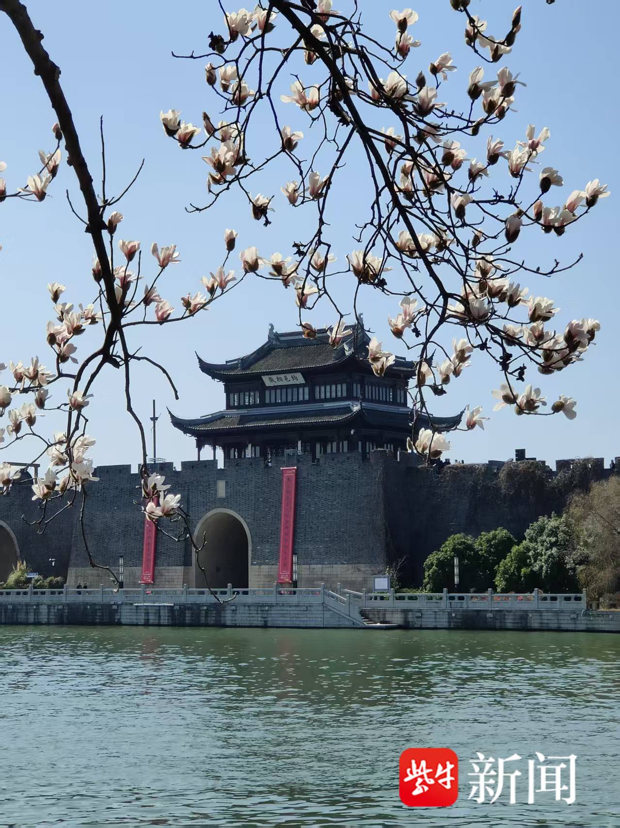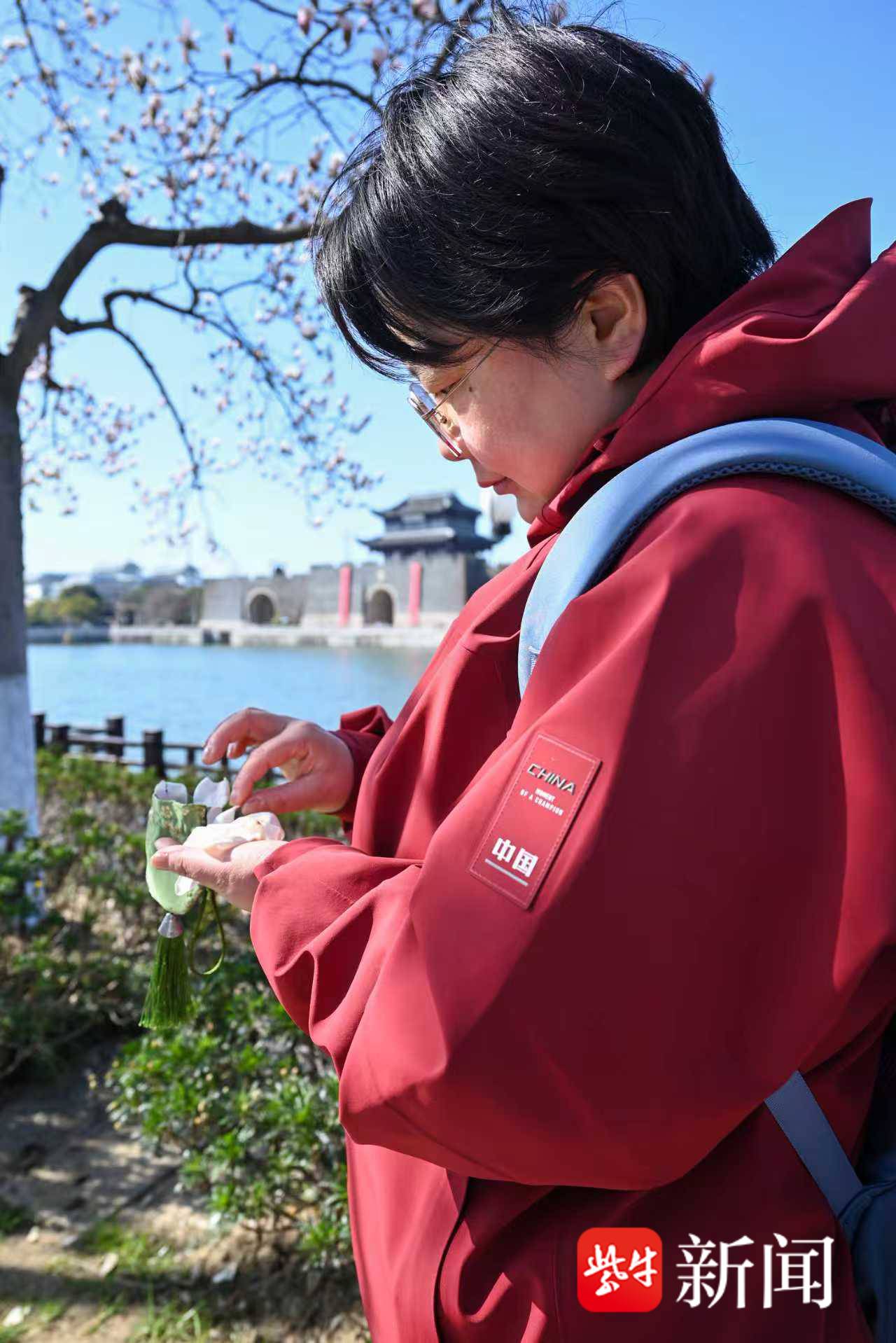 在姑苏区相门古城墙对岸的莫邪路段,两株玉兰率先吐蕊,色白微碧,花瓣基部晕染一抹粉红,微风拂过,花瓣轻落,铺就一地春意。来自山西的游客宫女士正巧路过,惊喜地拾起几片花瓣装进荷包,准备带回家留念:“没预约上景点,途径此处却遇见了最喜欢的玉兰,这趟旅行值了。”