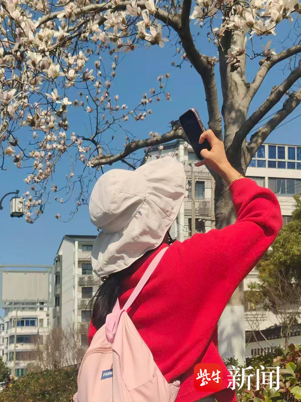 随着“苏州玉兰实况”“相门城墙白玉兰”等话题在社交平台持续刷屏,摄影爱好者纷纷出动,前来打卡。摄影爱好者史先生背着相机穿梭在花影间:“群里一百多人都在讨论这里的玉兰开了,我赶紧过来。莫邪路的玉兰花每年都是最早一批开的。”