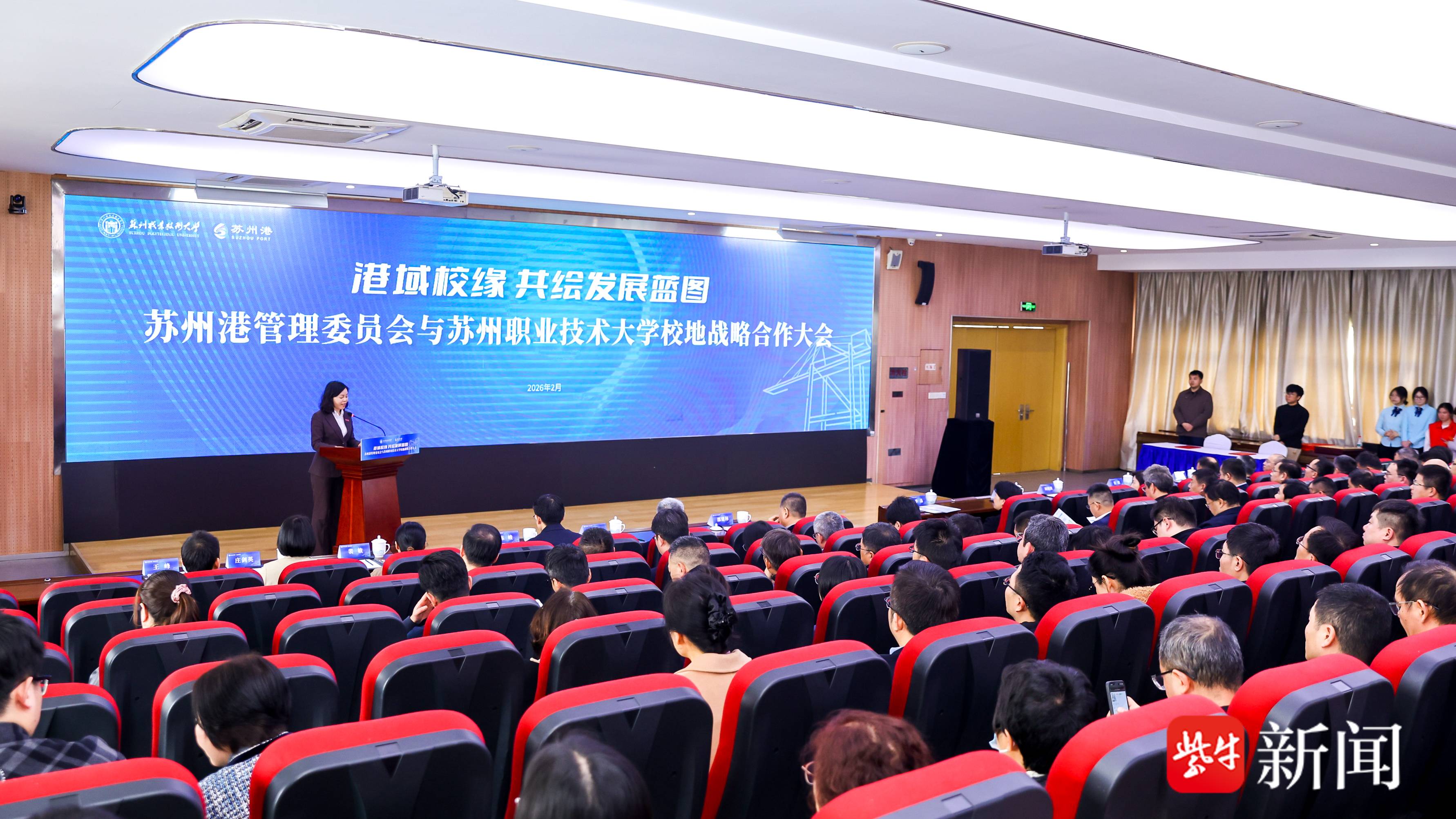 2月28日下午,苏州港管委会与苏州职业技术大学校地战略合作大会在苏州职业技术大学干将路校区举行。本次大会以“港域校缘 共绘发展蓝图”为主题,旨在深化产教融合,推动协同育人,共同服务苏州港航产业高质量发展。苏州市副市长季晶出席活动。