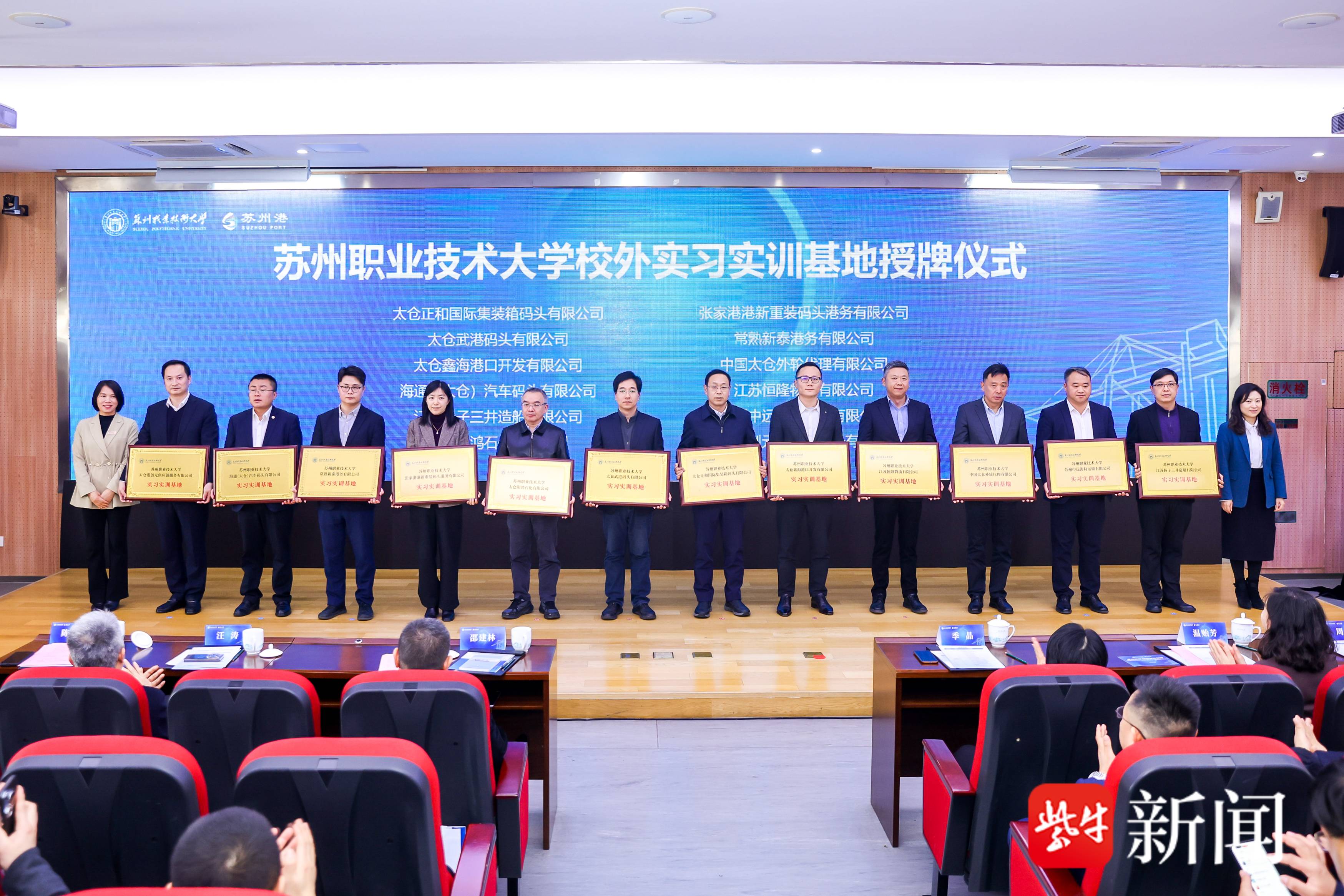 为强化实践教学平台,现场为12家苏州港范围内重点企业授牌校外“实习实训基地”。这些企业涵盖港口运营、航运物流、装备制造等多个领域,将为学生提供一线真实生产的实践平台。