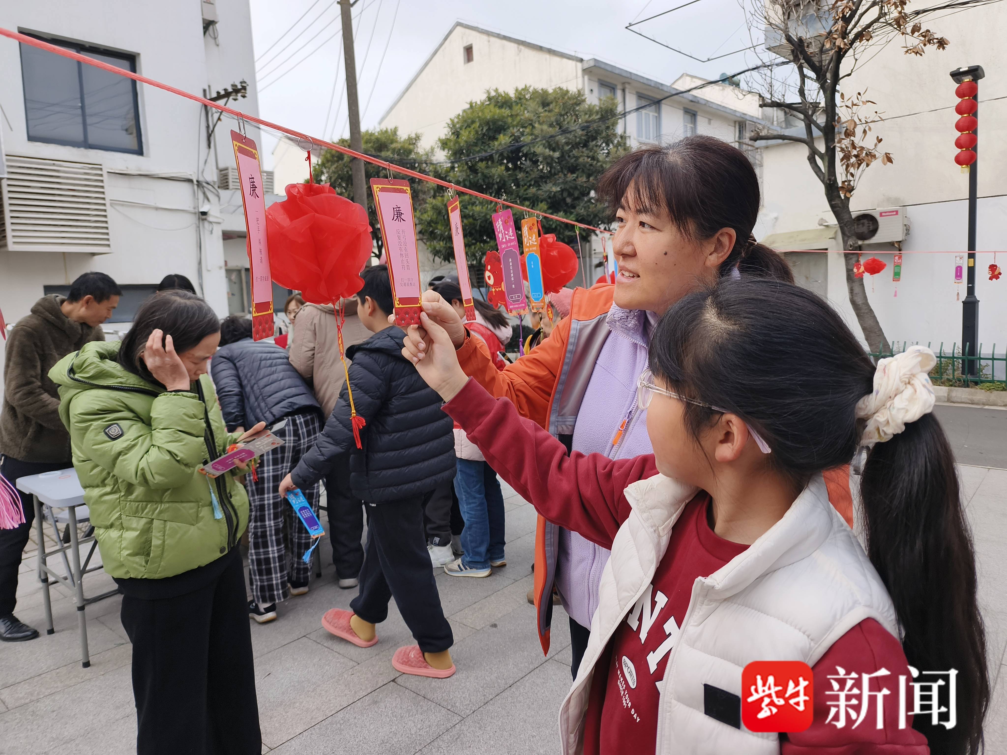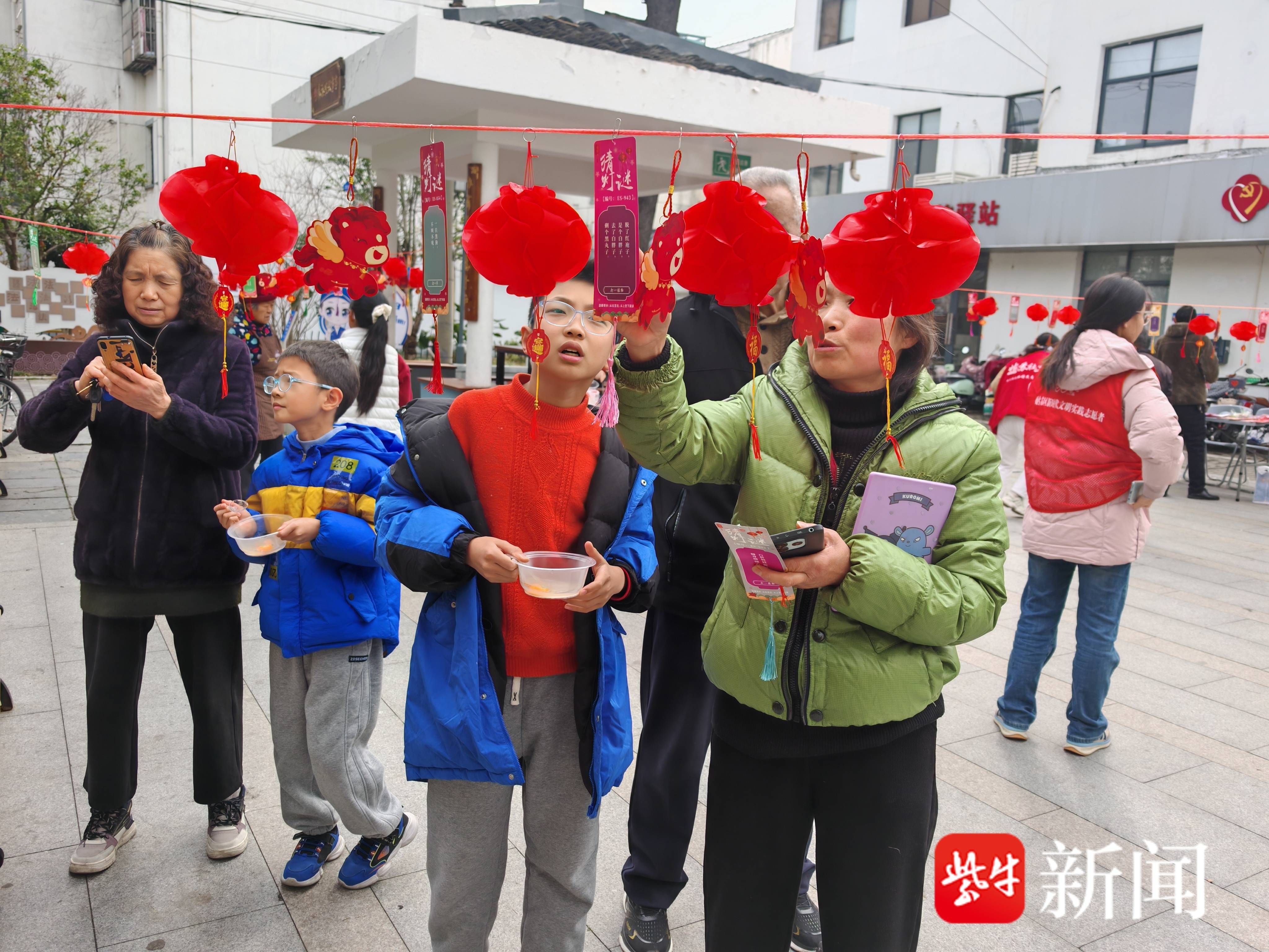 除了热气腾腾的汤圆,现场最热闹的当属“灯谜互动区”。五彩斑斓的灯谜纸条随风轻摆,吸引着居民们驻足凝思、热烈讨论。谜面内容丰富多样,既有传统的字谜、成语谜,也融入了移风易俗、垃圾分类、廉洁文化等贴近生活的新知识,既考验智慧,又寓教于乐。猜对谜底的居民满心欢喜地走向兑奖处,换取香皂、抽纸等实用又贴心的小奖品。