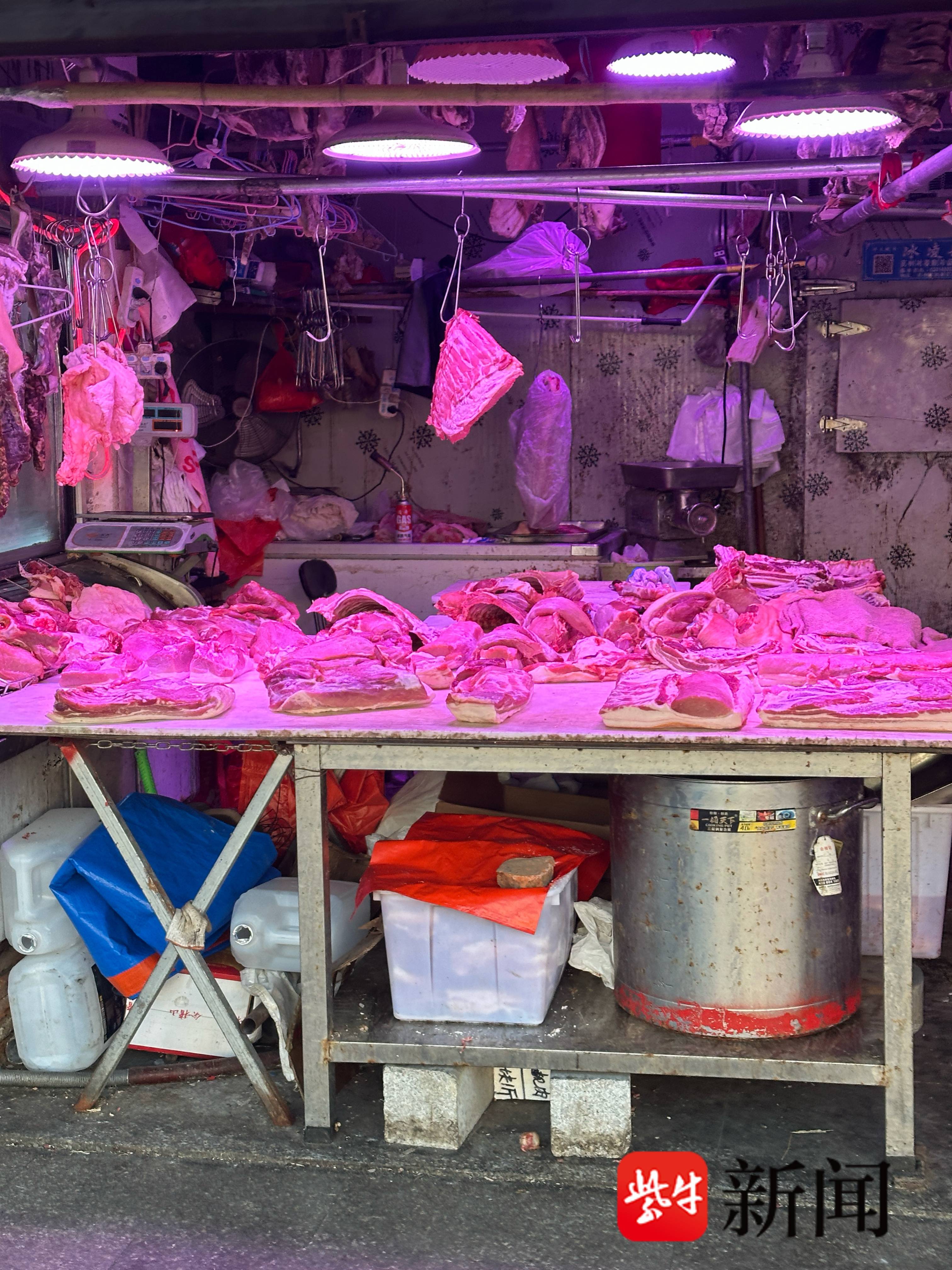 谈及市场外的沿街店铺,该老板颇为无奈:“外面那些‘肉红色’灯光很容易误导消费者,经常有顾客抱怨,说外面的肉看着更新鲜,其实都是灯光效果。”
