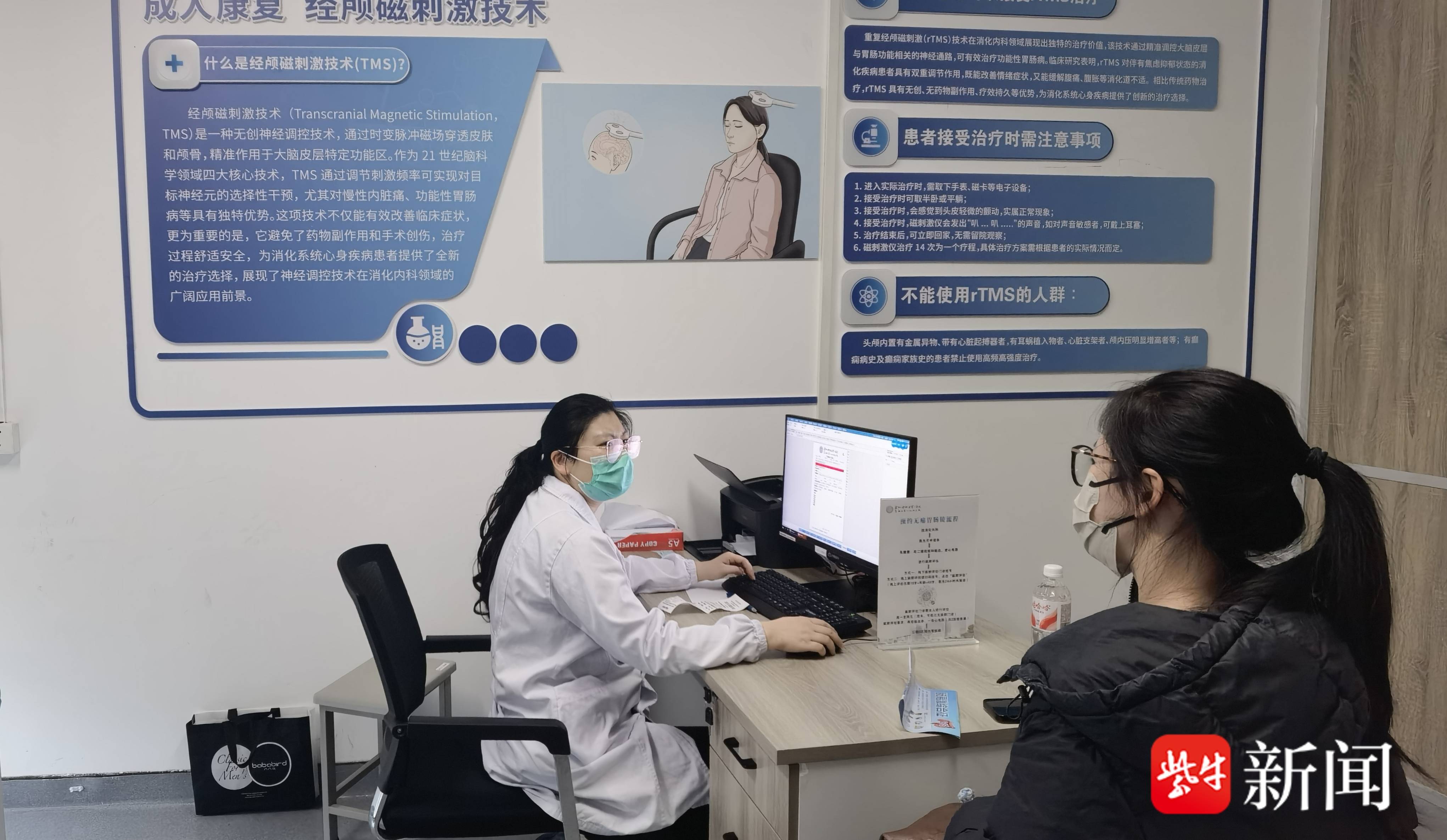 诊室里,医生先详细询问林女士的发病时间、症状频率、既往检查和用药情况,再结合她此前已经做过的胃肠镜等检查结果进行综合评估。根据目前的情况,林女士符合进一步接受经颅磁刺激治疗的条件。接下来,她将在工作日每天接受一次重复经颅磁刺激,每次约20分钟,一个疗程约两周。整个过程无需麻醉、无创无痛,治疗结束后即可离开。