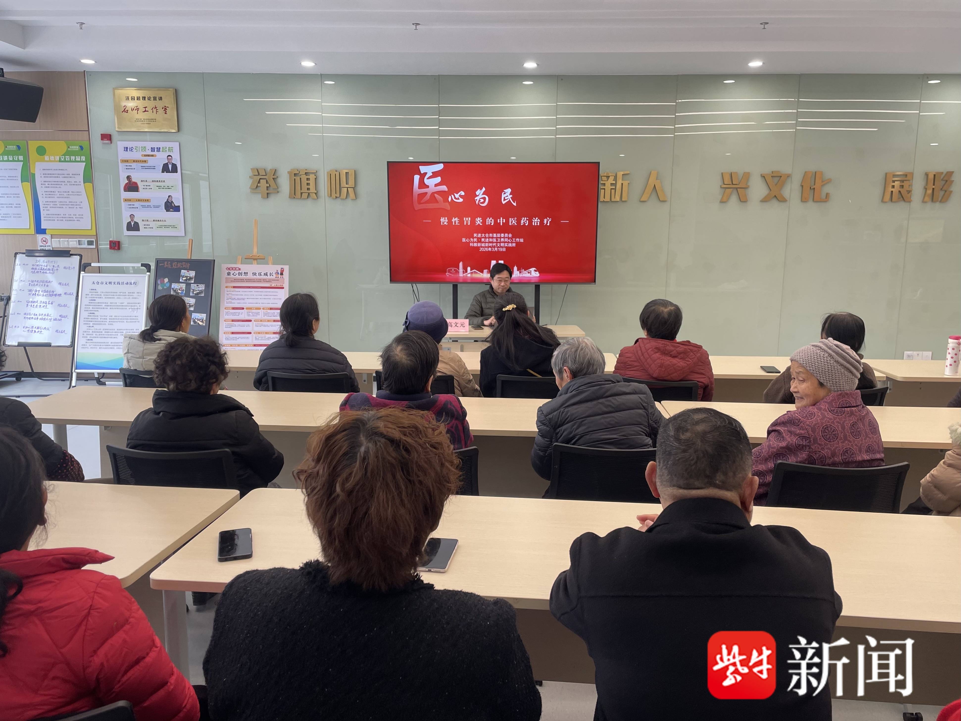3月19日,太仓市科教新城“医心为民”同心工作站2026年首场健康讲座在新时代文明实践所举行。本次讲座以“慢性胃炎的中医药治疗”为主题,邀请太仓市中医医院主任医师,从概述、病因、诊断、治疗、预防五个维度,为辖区居民带来一堂通俗实用的健康科普课。这是科教新城深化统一战线平台建设,整合优质医疗资源,将健康服务触角延伸至基层末梢,增进民生福祉的“微实事”。
