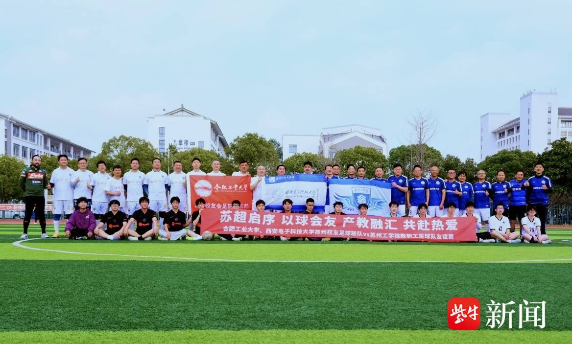 3月21日下午,苏州工学院东南校区足球场激情涌动,一场以“苏超启序、以球会友、产教融汇、共赴热爱”为主题的足球友谊赛在此火热开赛。苏州工学院教职工足球队、学生足球队与合肥工业大学、西安电子科技大学苏州校友足球联队同场竞技。赛前,校企座谈会同步举行,以体育为纽带,共话产教融合、校企合作新篇章,为即将启幕的2026“苏超”联赛注入青春动能。