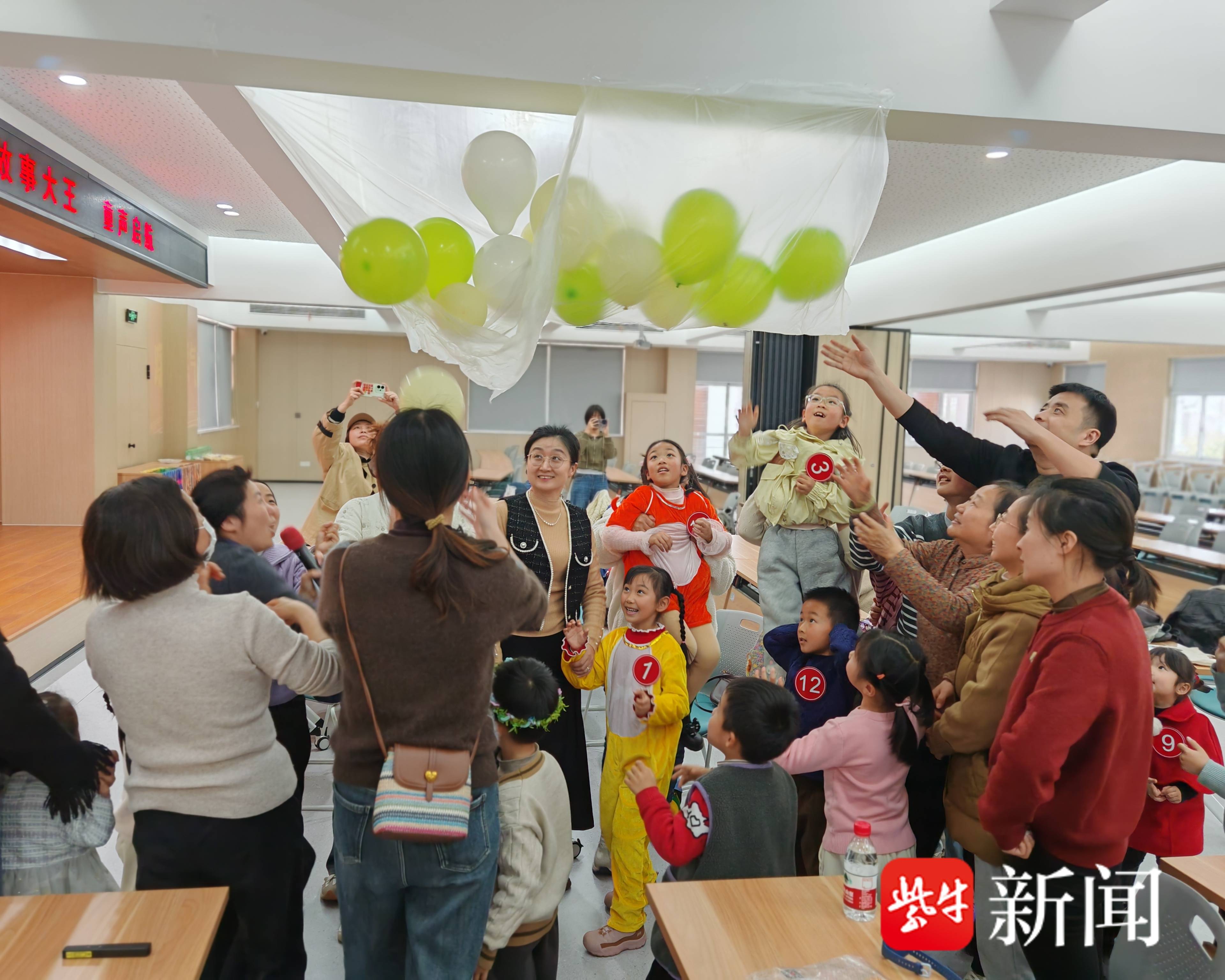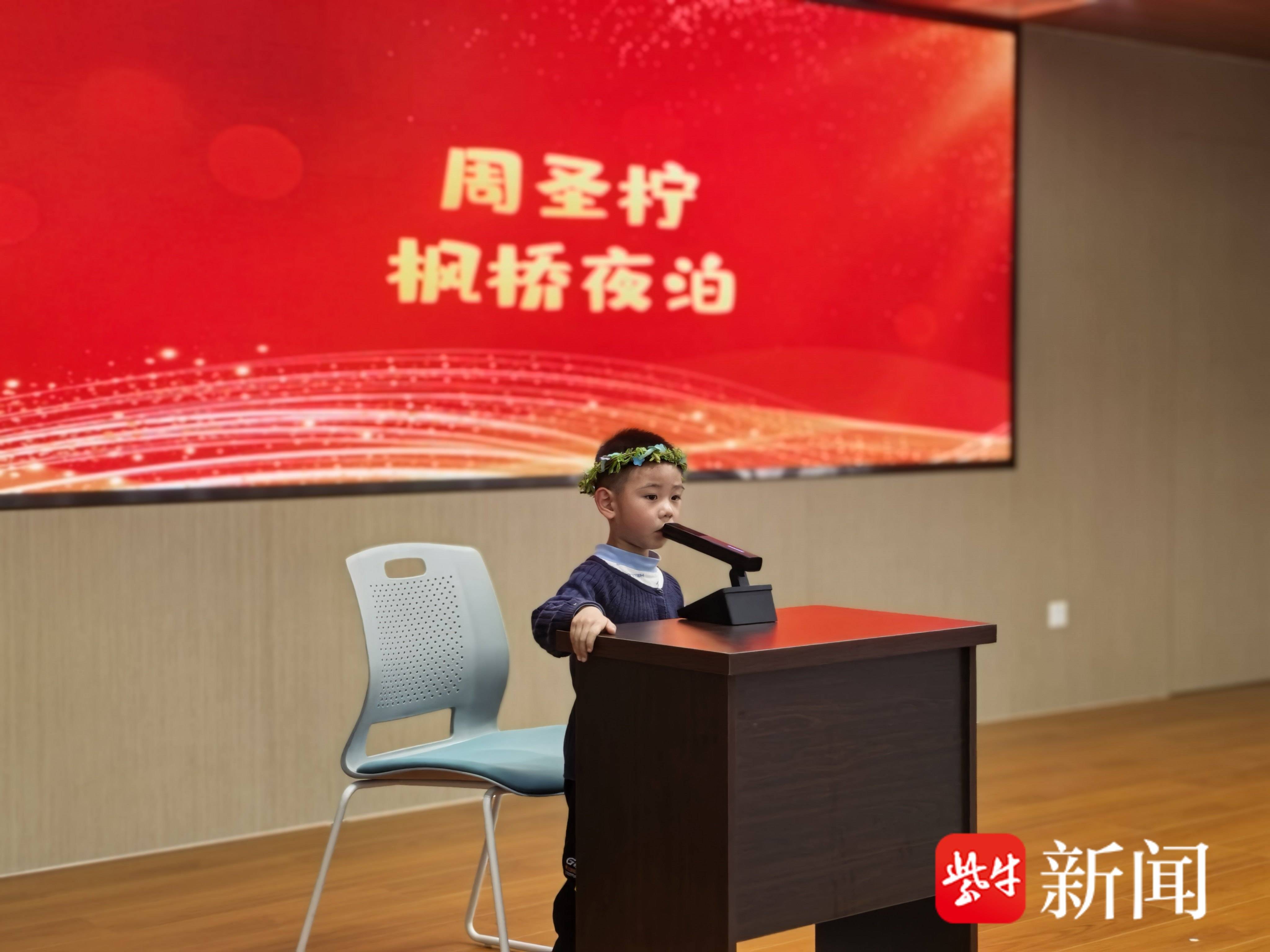 比赛现场温馨有序、童趣盎然。小选手们身着创意服饰,化身《想跳舞的螃蟹》《吵闹的邻居》等绘本中的角色,用清亮稚嫩的嗓音和自然灵动的肢体动作,将故事讲得生动传神;幼儿园小朋友周圣柠声情并茂地吟诵张继的《枫桥夜泊》,古韵悠长、抑扬顿挫;3岁的金花在奶奶的陪伴下,用苏州话演绎传统童谣《笃笃笃,卖糖粥》,语调软糯、节奏轻快,引得全场会心一笑、掌声不断。为缓解紧张情绪,现场特别穿插“踩气球”趣味互动环节,亲子协作、笑声飞扬,有效拉近了孩子、家长与社区之间的距离。