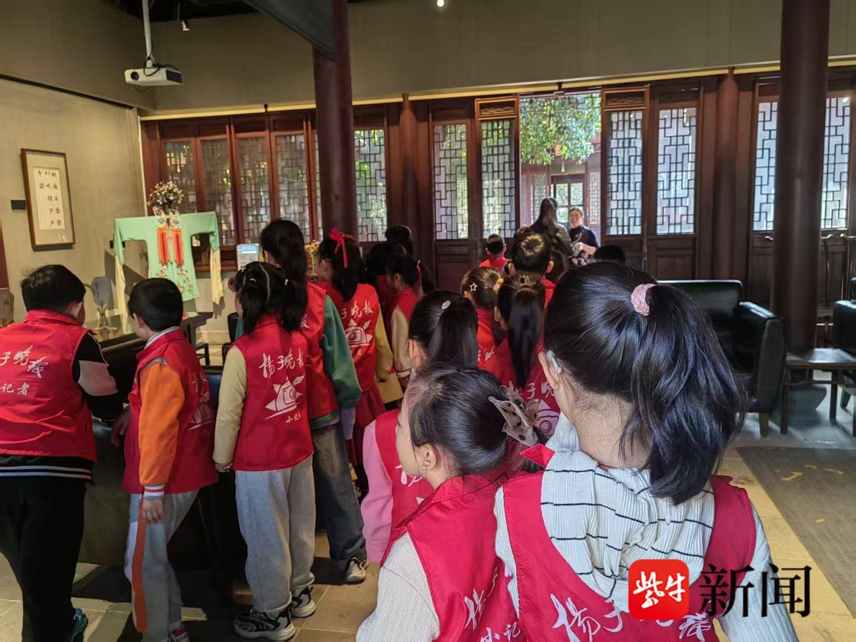 1、扬子晚报苏州小记者们在江苏省苏州昆剧院一楼大厅书吧集合签到,在扬子晚报苏州小记者工作室带队老师处领取装备;