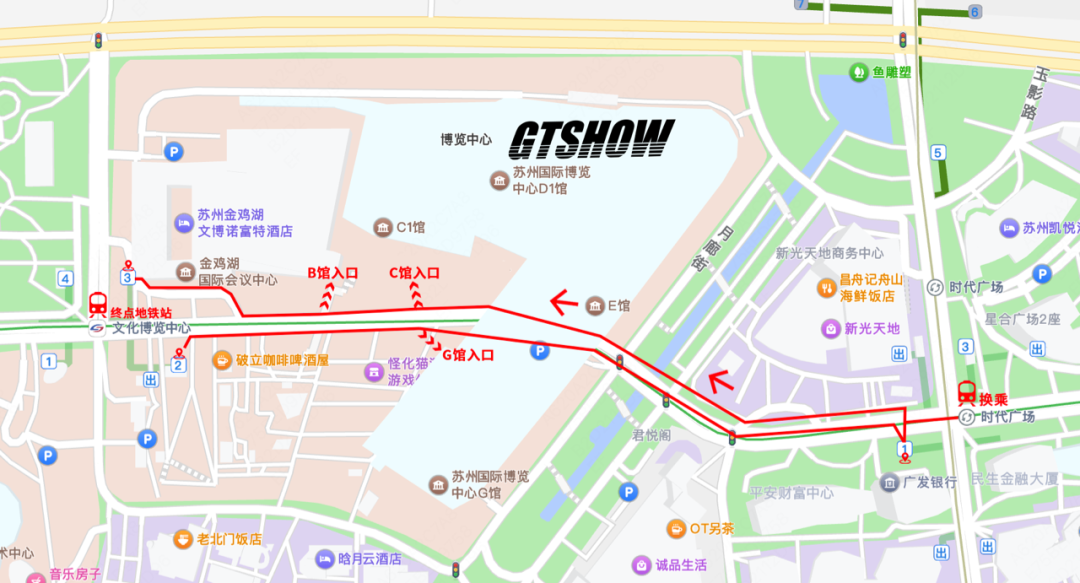 地铁出行:苏州地铁1号线文化博览中心站,3号出口步行100米;时代广场换乘站,4号口步行200米