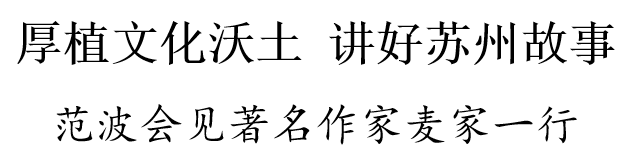 范波代表市委、市政府对麦家给予苏州文化事业发展的关心支持表示感谢。他说,苏州拥有2500多年的历史,是一座古今辉映、气韵生动的城市。当前,全市上下正深入践行习近平文化思想,全面推进文化强市“811”计划,着力深化人文经济学研究和实践,积极推动全民阅读和书香苏州建设,持续繁荣文化事业、壮大文化产业,全力打造人文与经济协调发展的实践高地。希望麦家一如既往关心苏州文化发展,多来苏州采风创作、讲学授业,助力苏州文艺精品创作和青年文学人才培养,带动更多优秀创作者扎根苏州、书写苏州,推动江南文脉在新时代焕发新生机。苏州将厚植江南文化发展沃土,完善文艺创作扶持机制,搭建文学交流平台,优化人才服务保障体系,让这里成为文艺创作的热土、人才成长的乐土,成为一个更加宜居宜业、精神更加富足的城市。