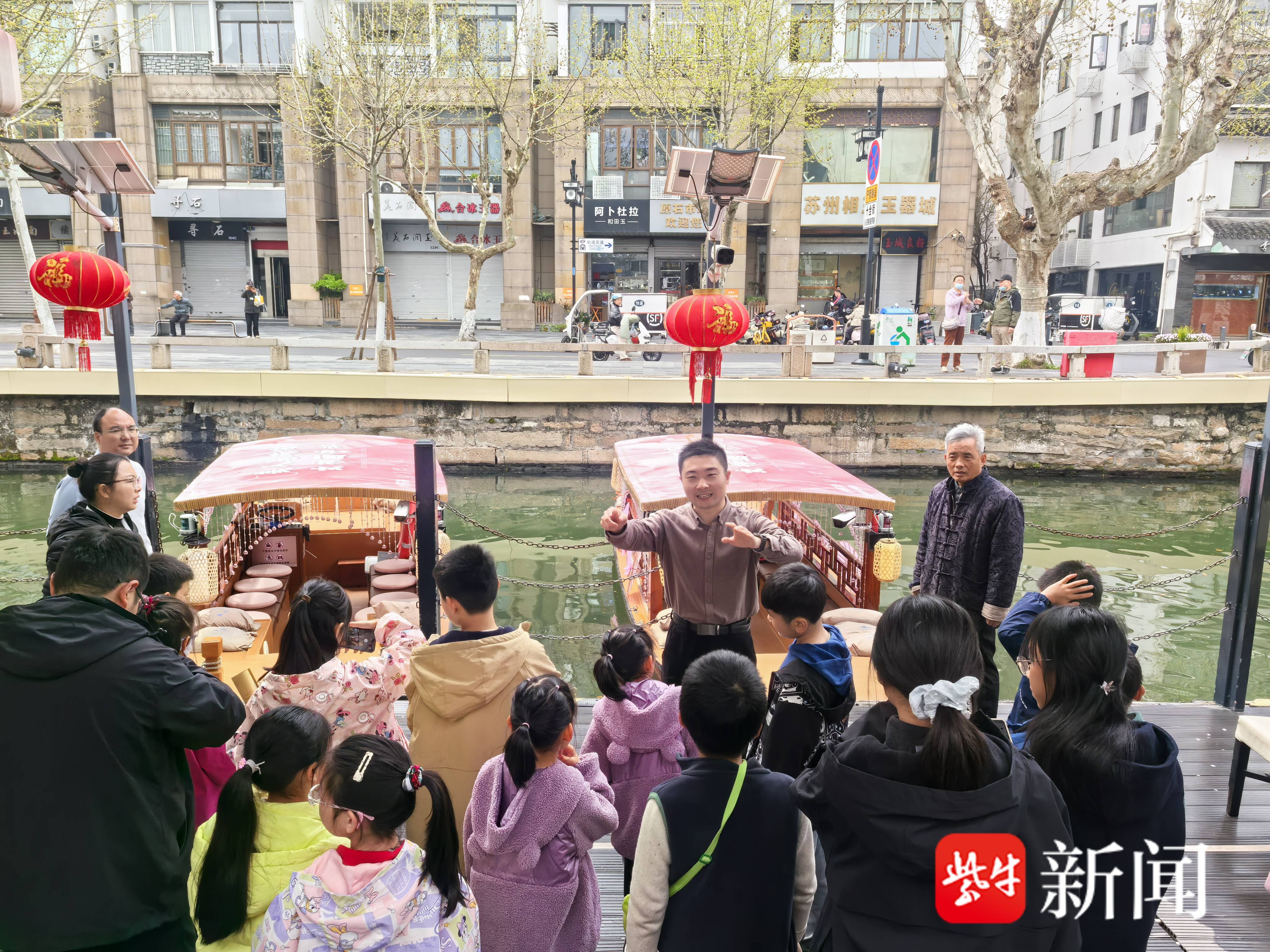 活动当天,家长与学生在姑苏游客驿站签到后,领取专属研学通关卡与姑苏宝藏研学地图。“苏州文庙里有一块圆碑,碑上刻着的《平江图》,表现的正是姑苏古城水陆并行的‘双棋盘格局’。”双塔街道综合处副处长季赵量一边引导孩子们观察街景,一边讲解:“每一条路旁,都对应着一条河。今天,家长走陆路,小朋友乘坐花船走水路,用这样一种方式,亲身体验苏州古城‘河街并行’的独特格局。”