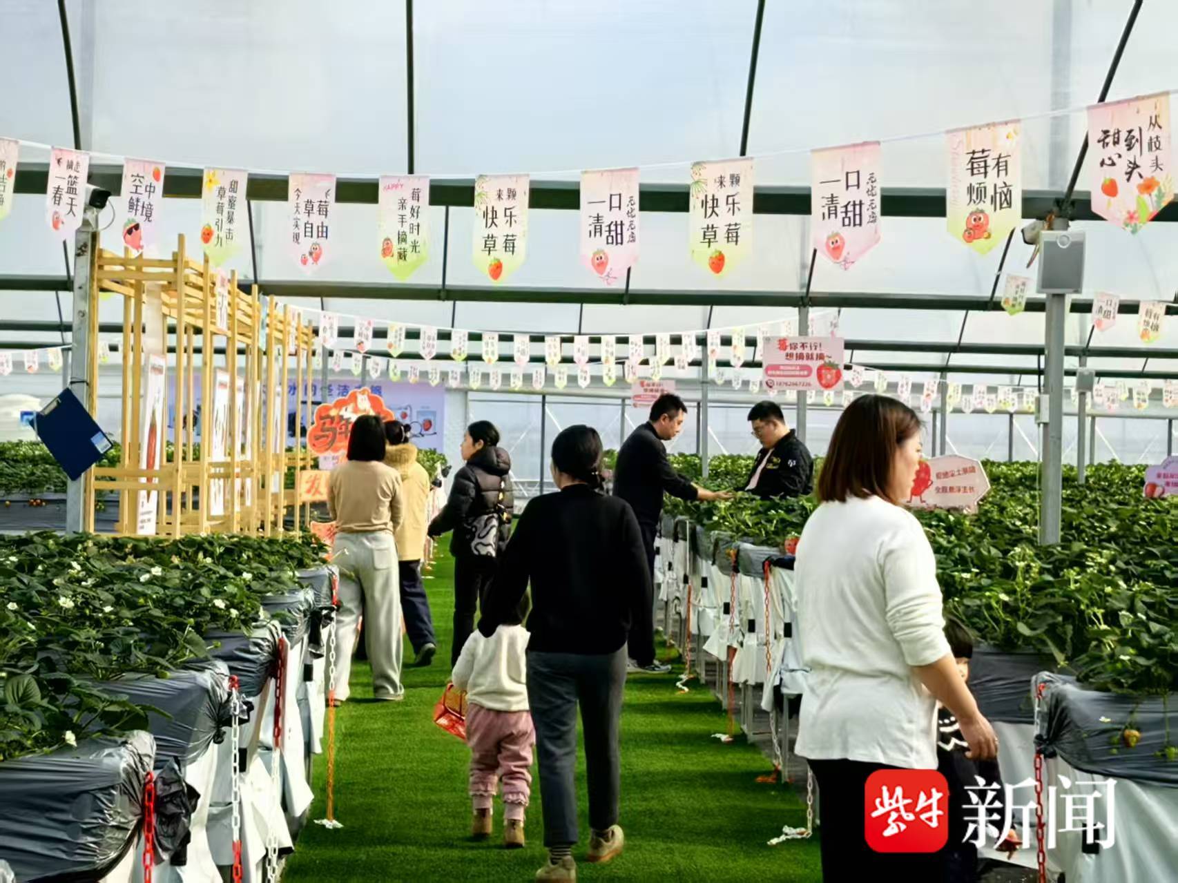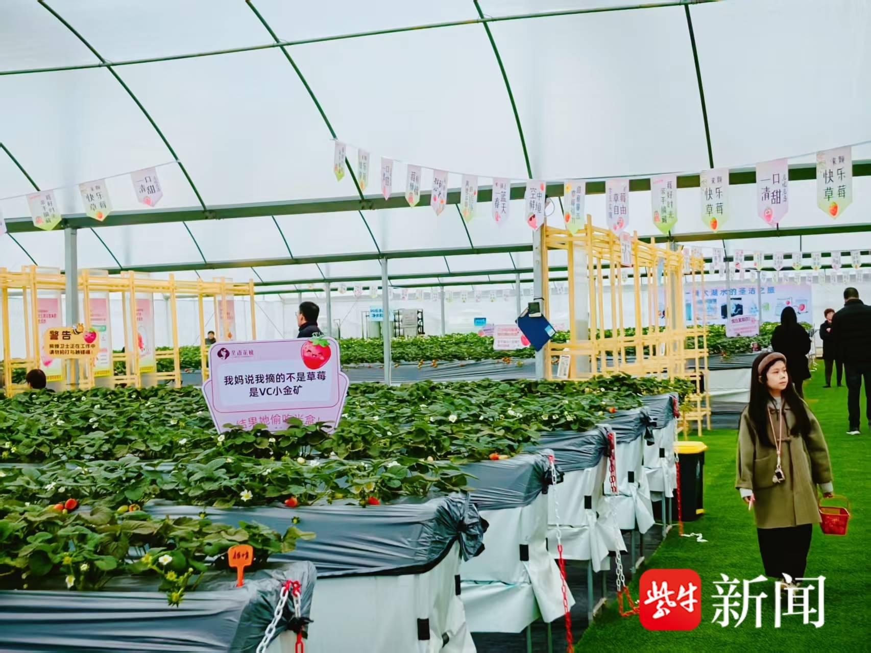 走进馨海花卉的草莓大棚,记者看到这里的草莓架高至齐腰,不用弯腰就能轻松摘取鲜果。“我们采用立体高架无土栽培技术,实现草莓离地种植,同时配合智能水肥系统环境传感器(温湿度/光照/CO₂监测),确保草莓洁净无污染,降低病害风险。”苏州花语吴娘园艺专业合作社理事长徐峻育介绍,今年2月推出“春日莓好生活节”,设立草莓露营区、草莓创意市集,单日客流超1300人次,开展草莓采摘、亲子研学等活动,让孩子在动手间感受“从田间到舌尖”的奇妙旅程。