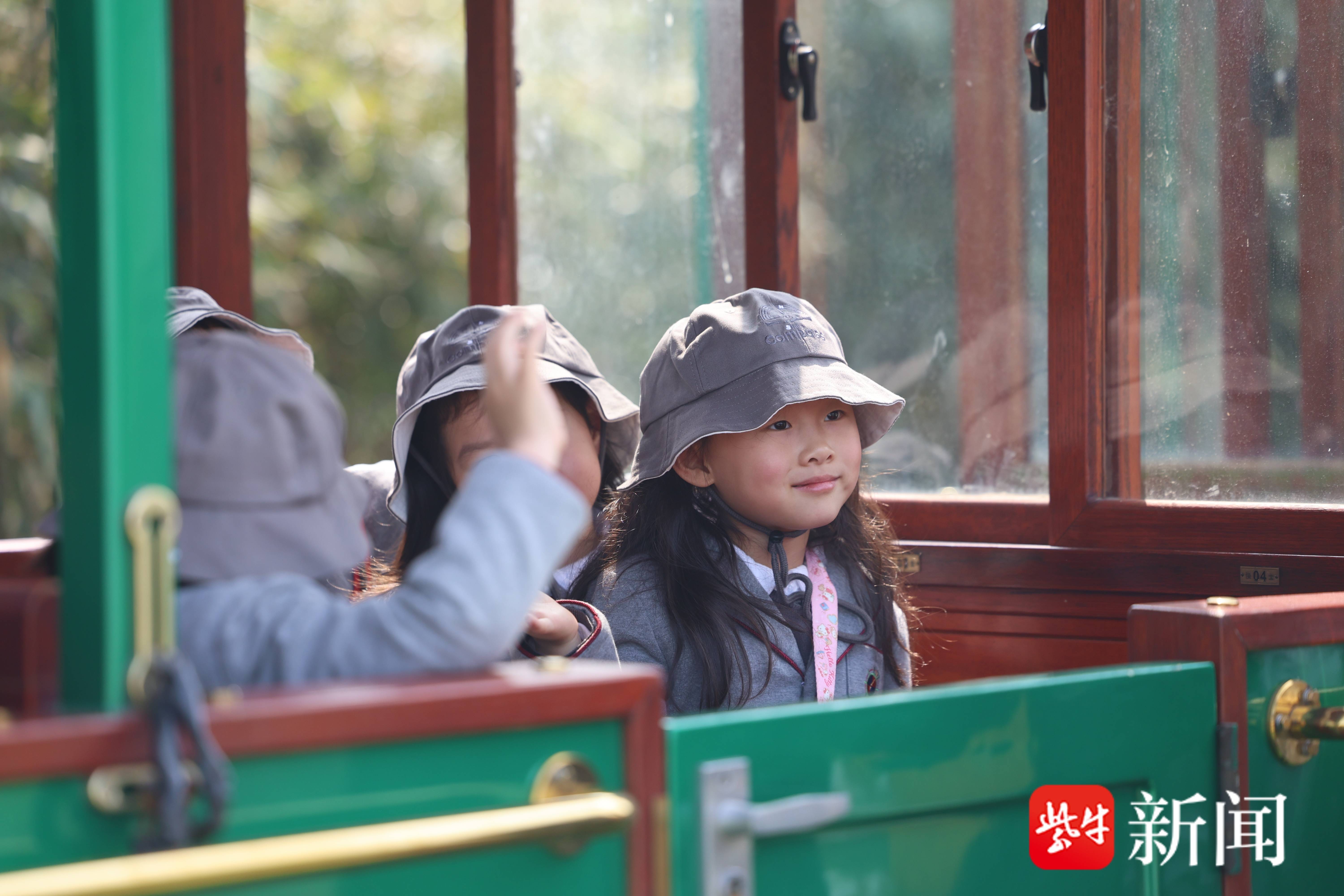 孩子们依次登上小火车,沿着轨道缓缓驶入花田。金黄的油菜花、粉色的海棠、蓝紫色的二月兰从车窗边掠过,水杉林间光影斑驳。车厢里,小朋友们指着外面的花兴奋地喊出声来,几位老师掏出手机帮孩子们拍照。火车经过弯道时,车厢里响起一阵阵笑声。有小朋友形容“像开进了蛋糕里面”,还有的说“这个火车好惊喜,不想下去”。