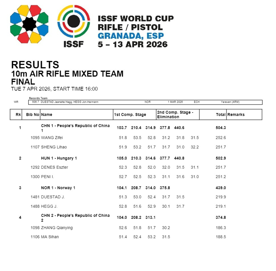这两场混合团体决赛采用最新竞赛规则,共有四对组合晋级决赛,每名选手在决赛中先进行3组射击,每组打5发,之后的第4、第5组射击,每名选手每组各打3发,依次产生第4名、第3名,第6组射击,每名选手打3发,最终环值最高的组合夺冠。