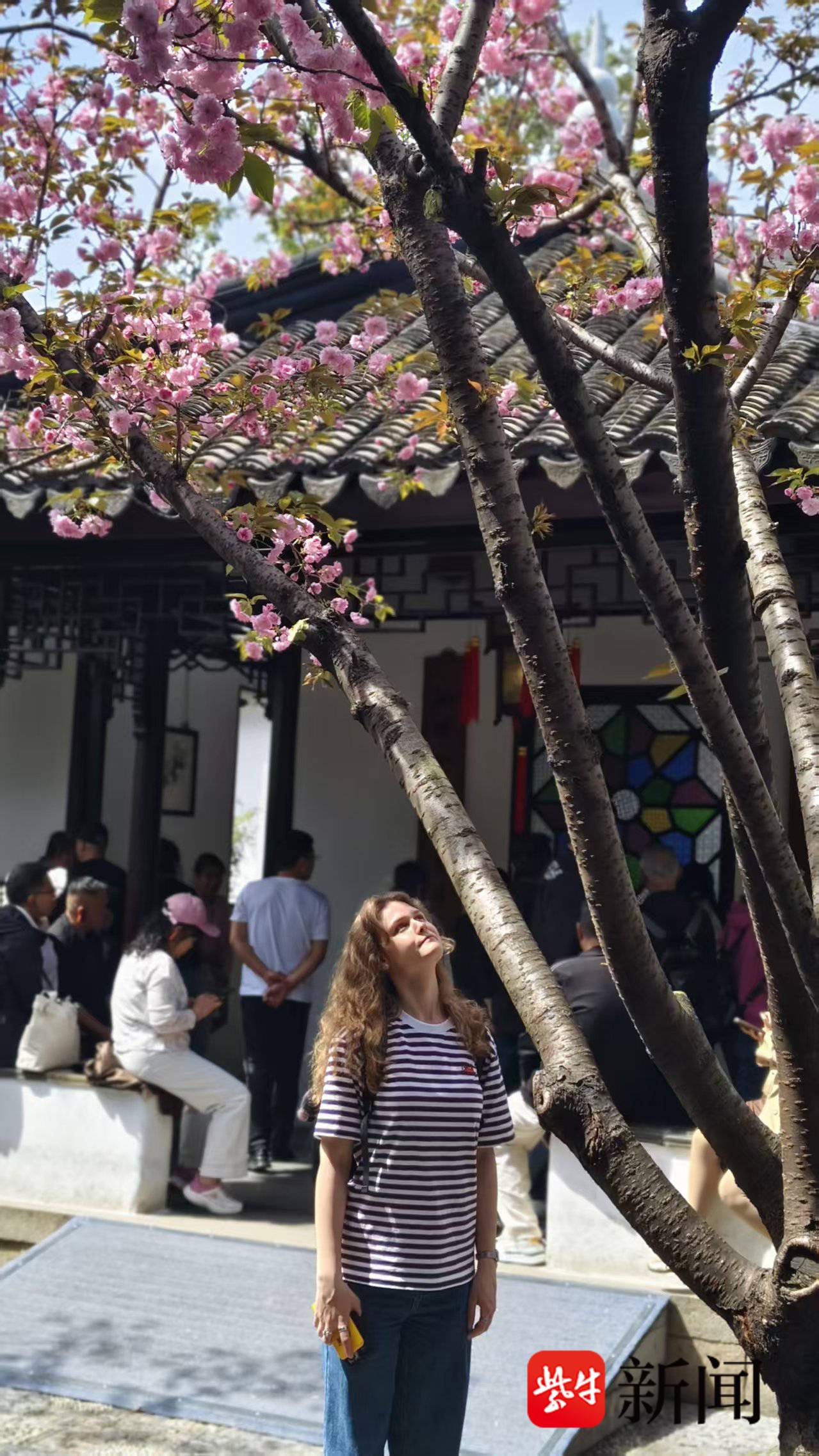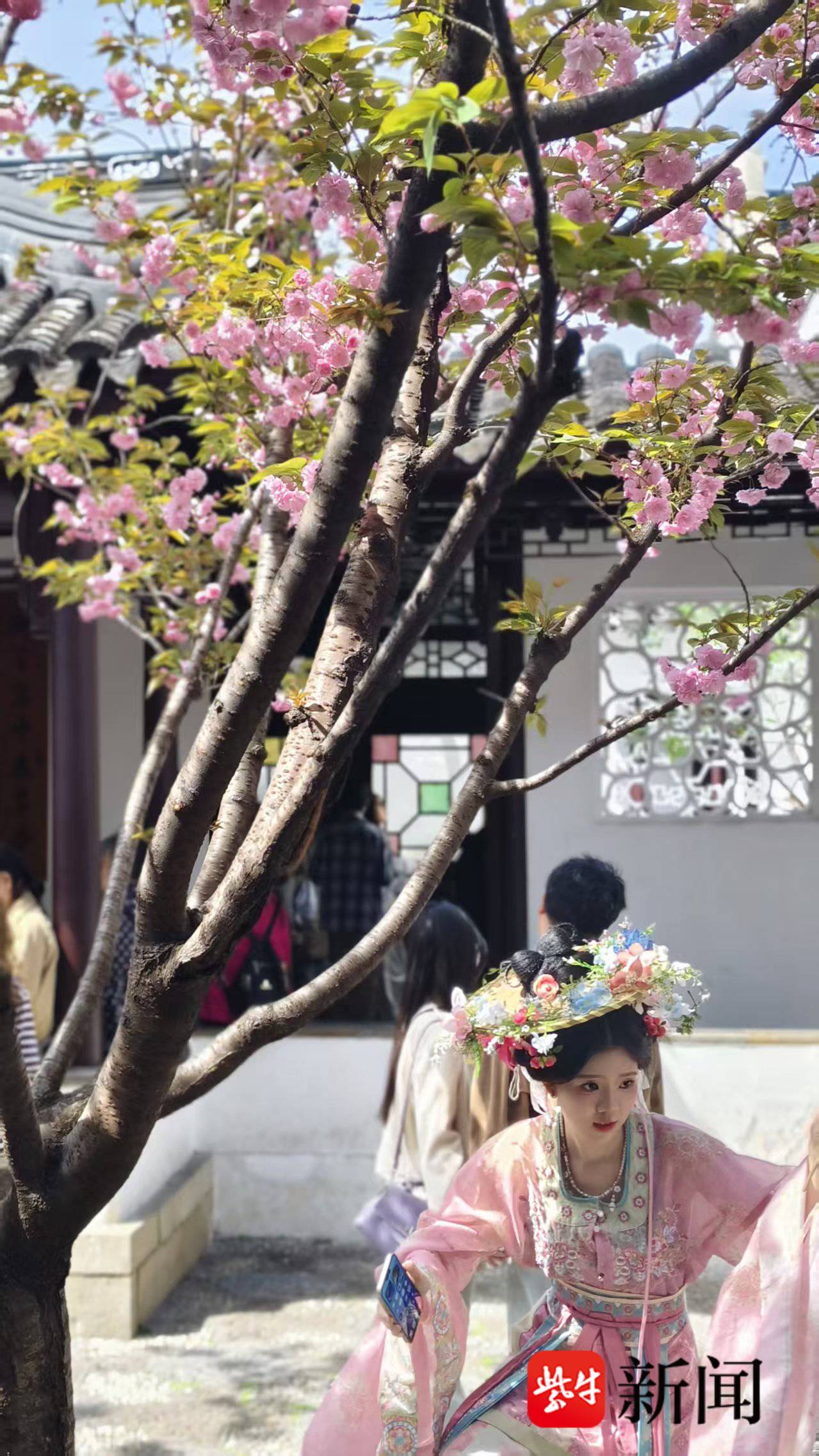 在各大苏州园林,海棠自带古典美学滤镜。记者在拙政园赏花核心区“海棠春坞”看到,两株百年垂丝海棠倚墙怒放,粉白花瓣轻柔垂落,如烟如霞。漫步其间,仿佛踏入古人笔下的诗画意境,是摄影爱好者追逐打卡的 “国风出片地”,身穿汉服或旗袍的游客在花下拍照打卡,仿佛从古画中走来。此外,听雨轩、兰雪堂附近也有海棠点缀,花影与亭台、流水相映,随手一拍便是江南韵味。