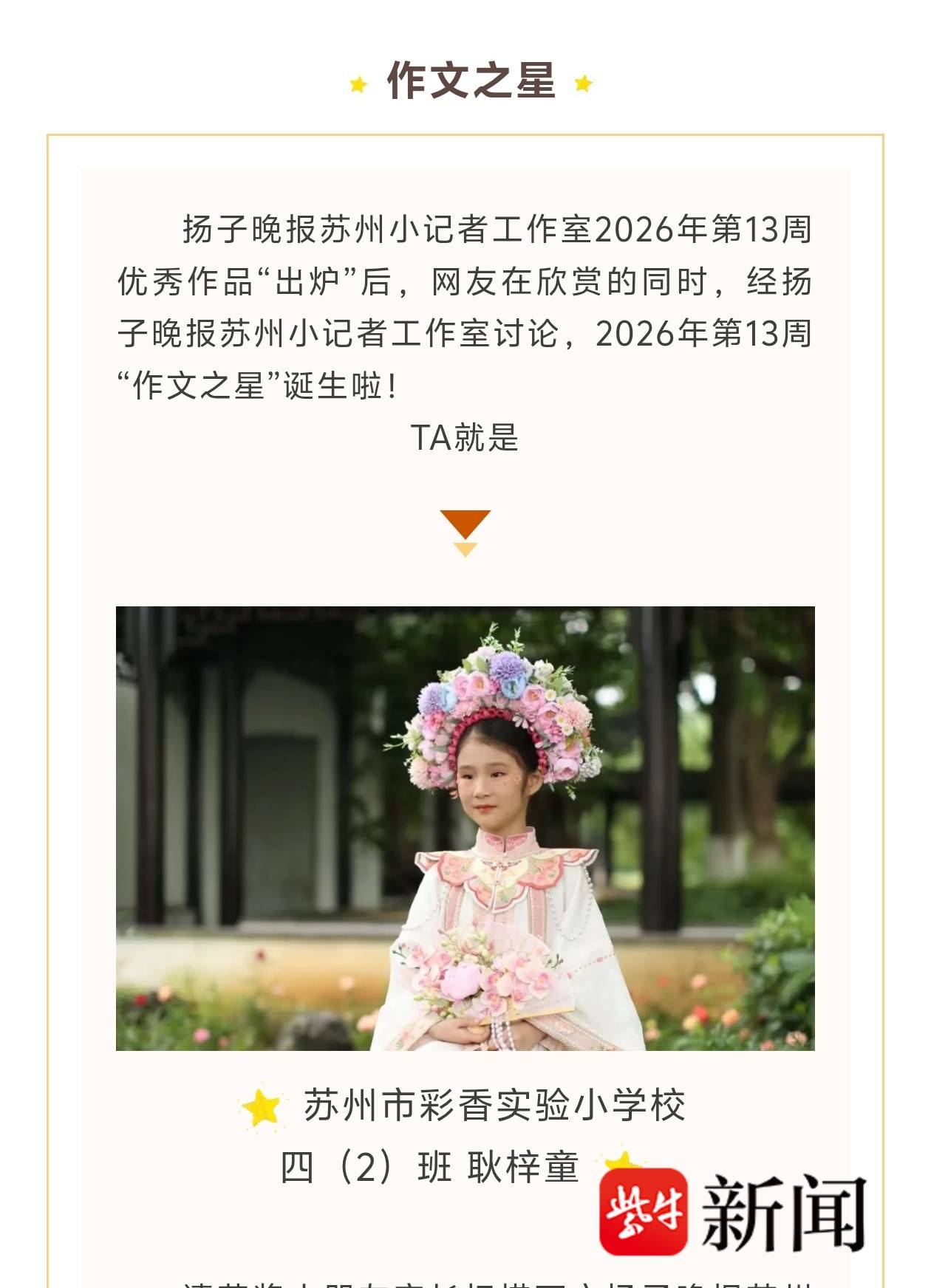 近日,苏州市彩香实验小学校四年级(2)班学生耿梓童凭借作文《身边的纳米技术》,被评为2026年第13周“作文之星”。该作文是学生从自身观察视角出发,以“身边的纳米技术”为主题,将抽象的纳米科技转化为具体可感的生活用品。文章通过三个生活化例子——纳米雨伞不沾水不沾泥、纳米玻璃便于清洁、纳米缓释驱蚊手环延长香气时间,展示了纳米技术如何让日常生活更加便利,体现了科学知识与实际应用的紧密联系。