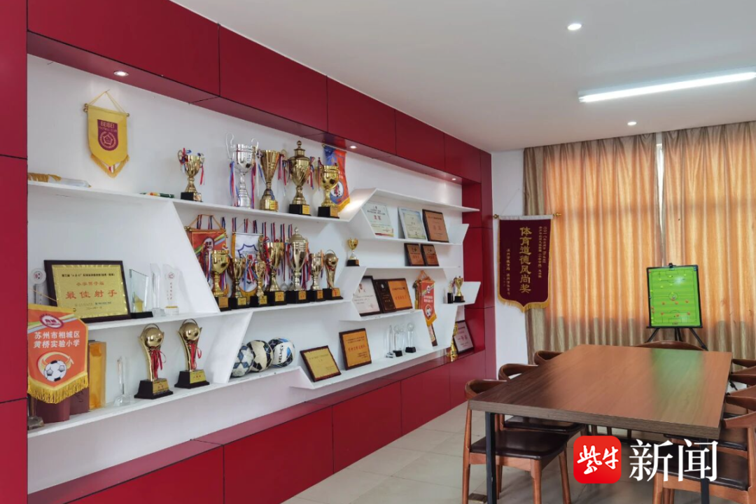 这里有科学系统的训练体系,黄桥实小将足球基本技术融入日常教学之中,组织学生学习运球、传球、颠球、射门等基本技能。这里有浓厚的足球氛围,荣誉室里的一座座奖杯,见证着每一位足球少年的成长与荣光。