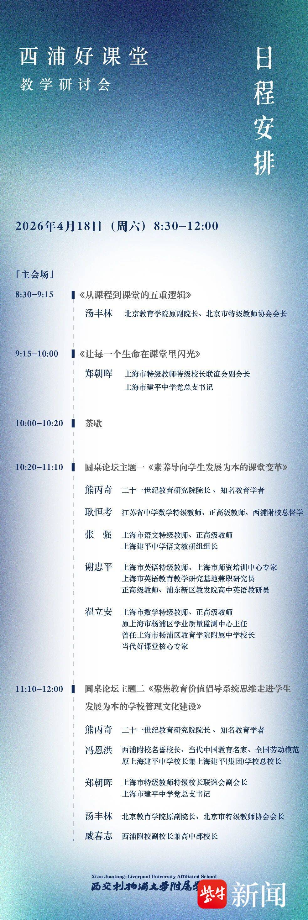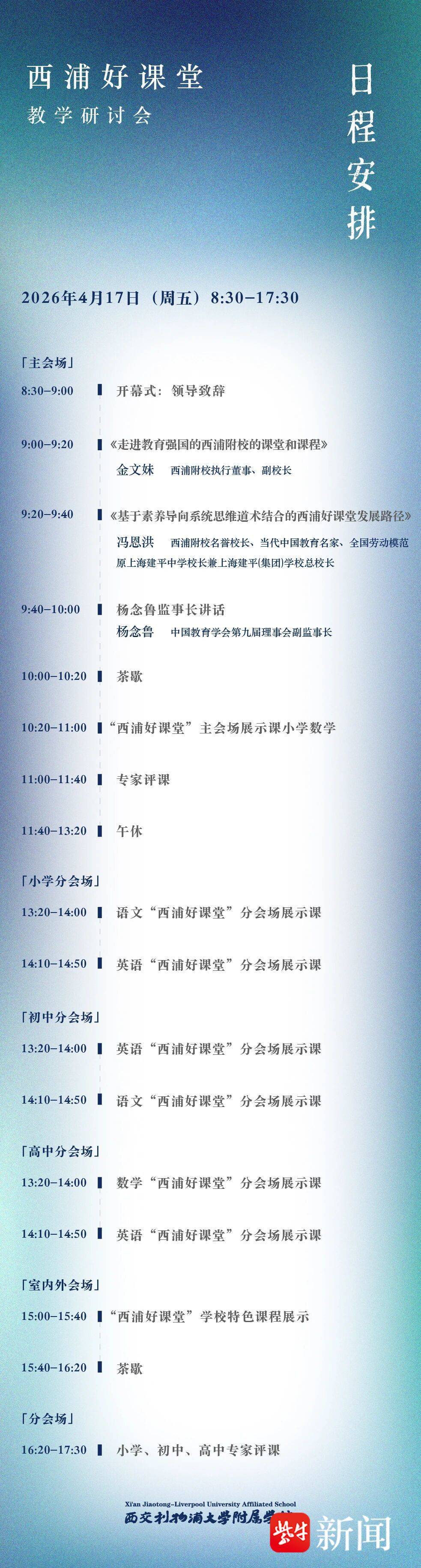 4月17日至18日,由陕西师范大学、西交利物浦大学、苏州市吴中区教育局共同主办,苏州市吴中区西浦附属学校承办,上海浦东当代好课堂教育发展中心、课堂文化发展联盟协办,二十一世纪教育研究院未来教育共同体提供学术支持的“西浦好课堂”教学研讨会——名家名师同评一堂课活动将在苏州市吴中区西浦附属学校举行。