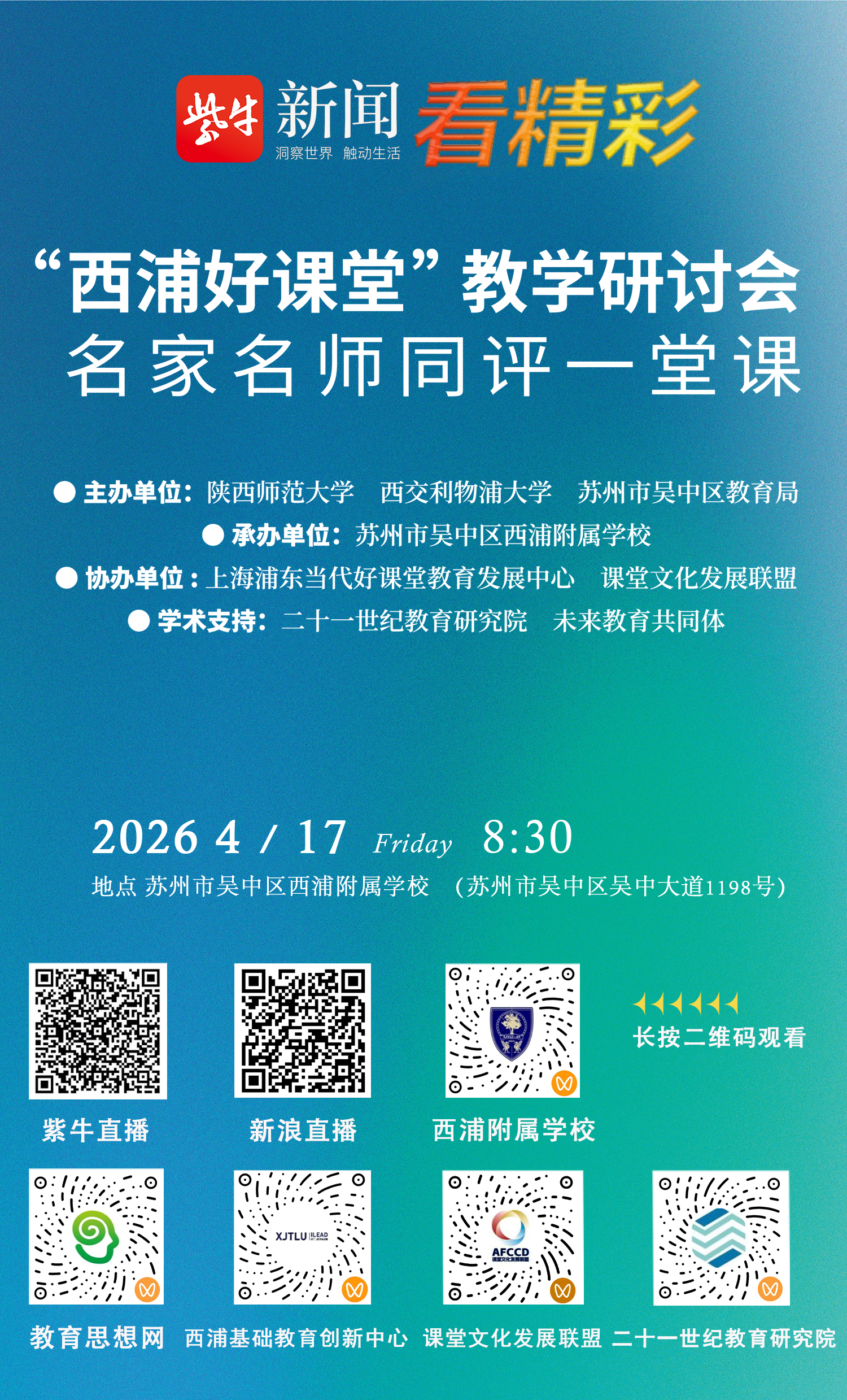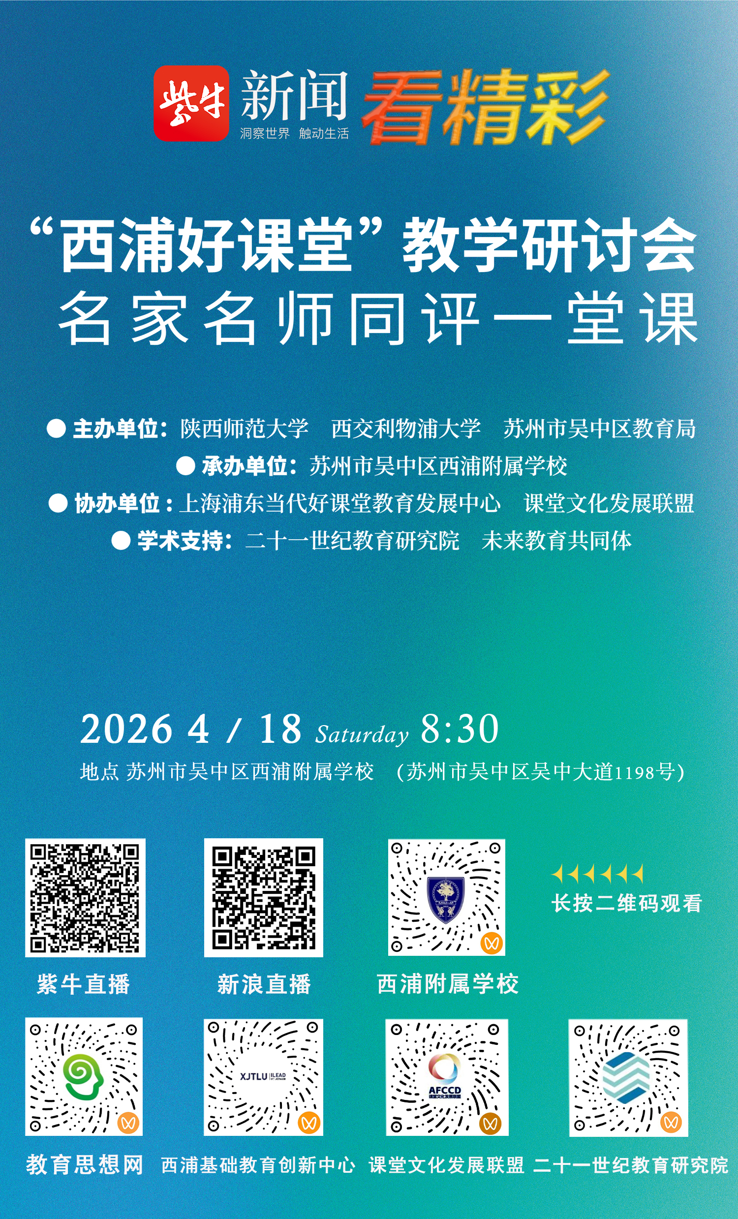 扬子晚报新闻客户端“紫牛新闻”、新浪直播以及西浦附属学校、教育思想网、西浦基础教育创新中心、课堂文化发展联盟、二十一世纪教育研究院视频号将对本次活动进行现场直播。