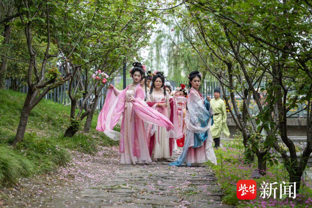 不远处,古装巡游队伍正穿街而来。二十余位身着汉服的表演者列队而行,宋制的褙子清雅飘逸,明制的披风端庄大气,唐制的齐胸襦裙在春风中轻扬。走在队伍前列的“花神”手持团扇,身后跟着“才子”“仕女”与“书生”,衣袂翩跹间,仿佛从古画中走出。巡游队伍经过桃花打卡墙时,一位扮作李白模样的少年即兴吟诵:“云想衣裳花想容——”围观游客齐声接上:“春风拂槛露华浓!”笑声与喝彩声交织在一起。