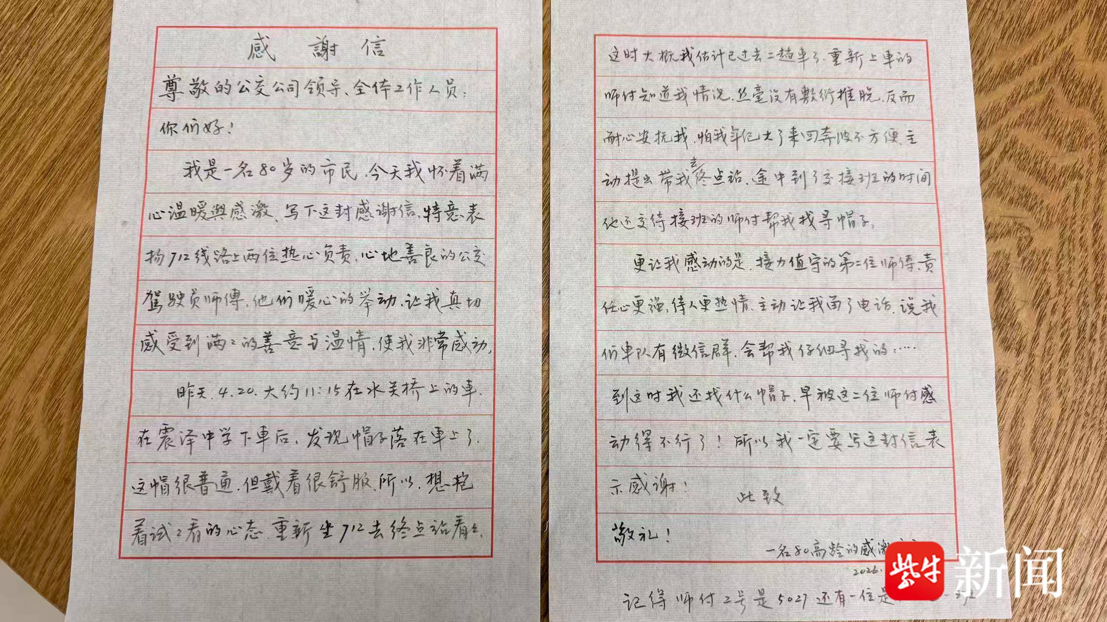 “我怀着满心温暖与感激,写下这封感谢信,特意表扬712线路上两位热心负责、心地善良的公交驾驶员师傅。”近日,苏州公交集团吴江公司收到了一封来自一位80岁高龄乘客的手写感谢信,来信字迹工整、情真意切,字里行间流露着由衷的谢意。