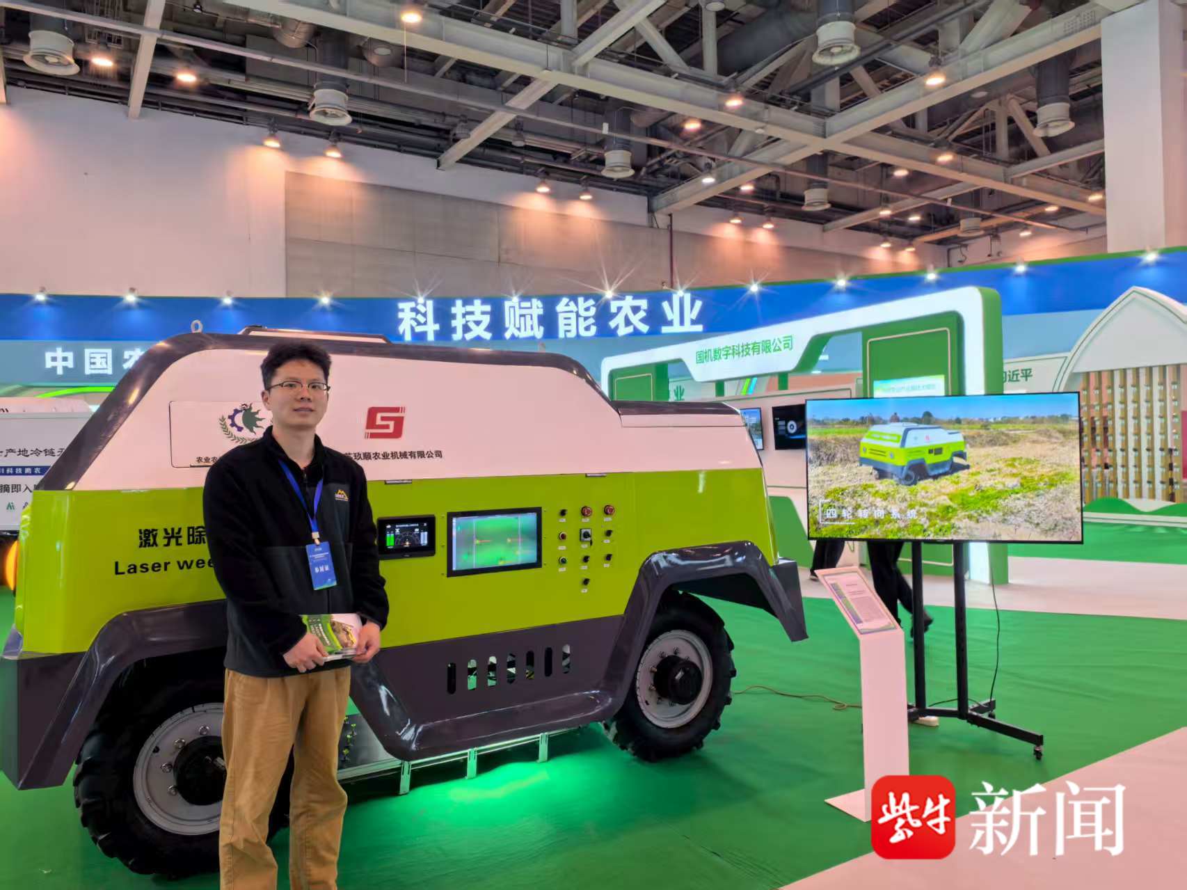 农业前沿科技成果展区现场,由农业农村部南京农业机械化研究所与江苏玖顺农业机械有限公司联合研发的智能激光除草机器人格外“吸睛”。