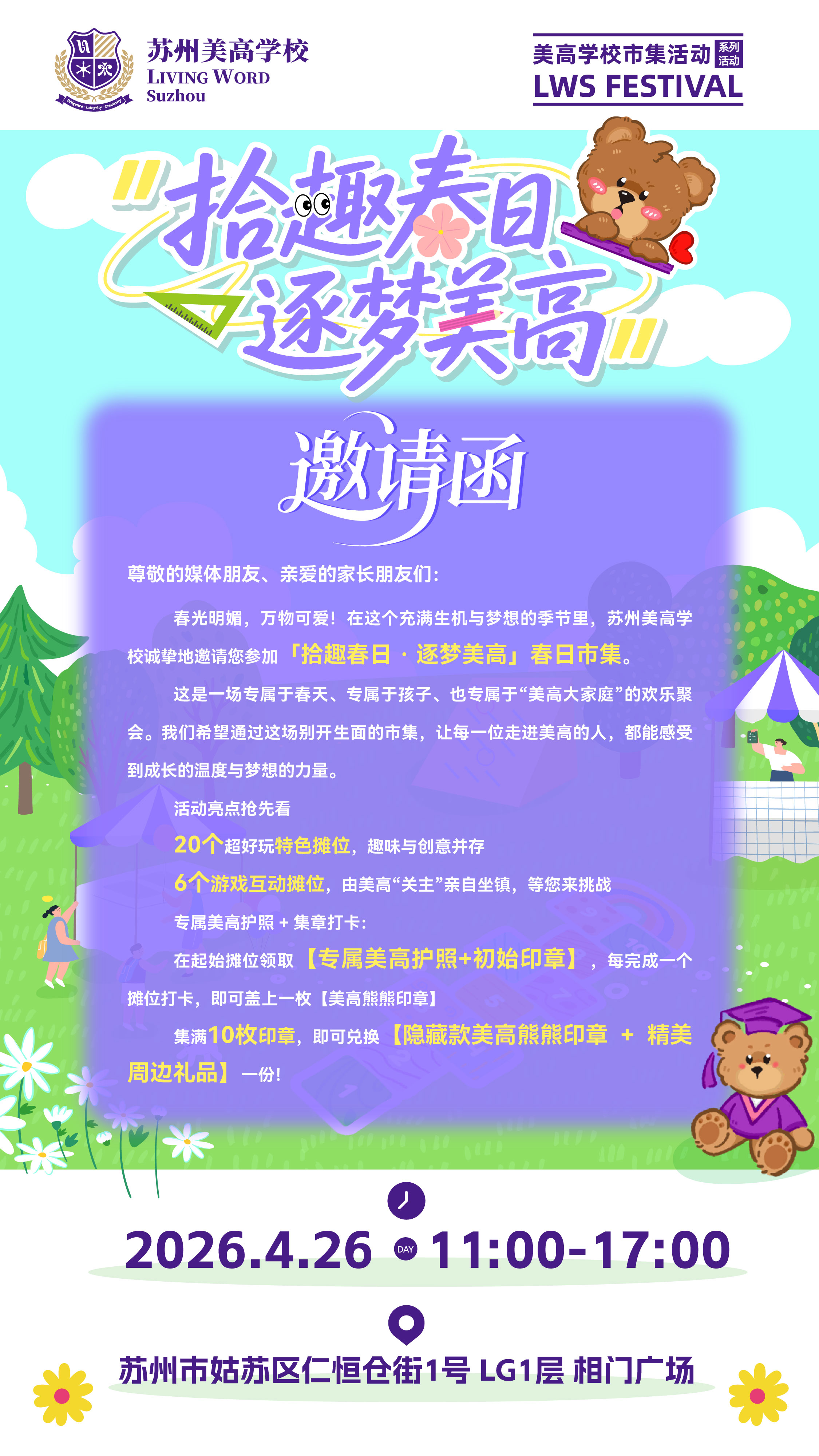 在这个充满生机与梦想的季节里,苏州美高学校诚挚邀请您参加“拾趣春日•逐梦美高”春日市集。这是一场专属于春天、专属于孩子,也专属于“美高大家庭”的欢乐聚会。学校希望通过这场别开生面的市集,让每一位走进美高的人都能感受到成长的温度与梦想的力量。