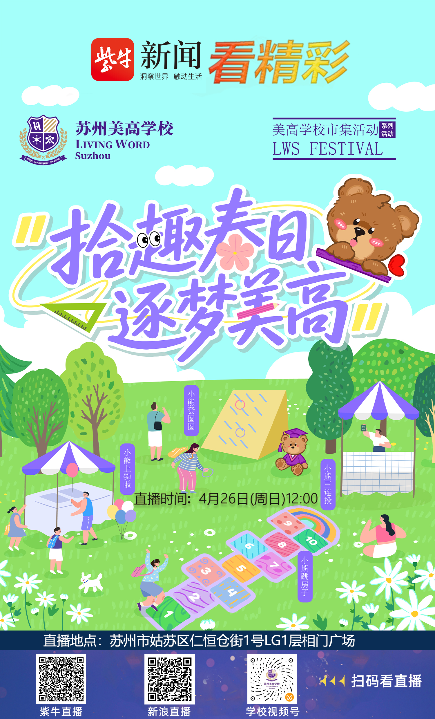 春光明媚,万物可爱!4月26日,苏州美高学校“拾趣春日•逐梦美高”春日市集将在苏州市姑苏区仁恒仓街相门广场举行。扬子晚报新闻客户端“紫牛新闻”、新浪直播以及学校视频号将对本次活动进行现场直播,带你直击精彩现场。