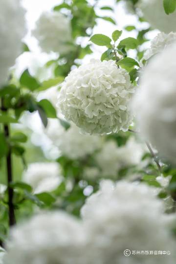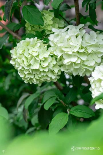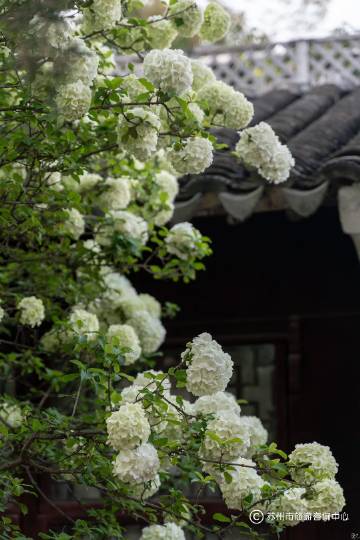 沧浪亭的木绣球位于藕花水榭前,在精巧的花窗框景中,美成了一幅工笔画。一团团,一簇簇的木绣球,正如明代谢榛的诗里所云“高枝带雨压雕栏,一蒂千花白玉团”。
