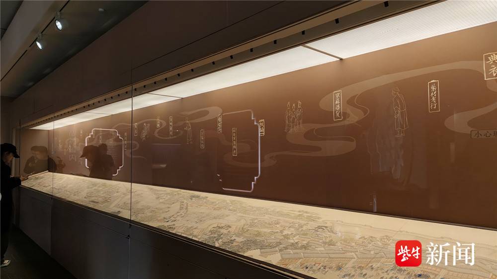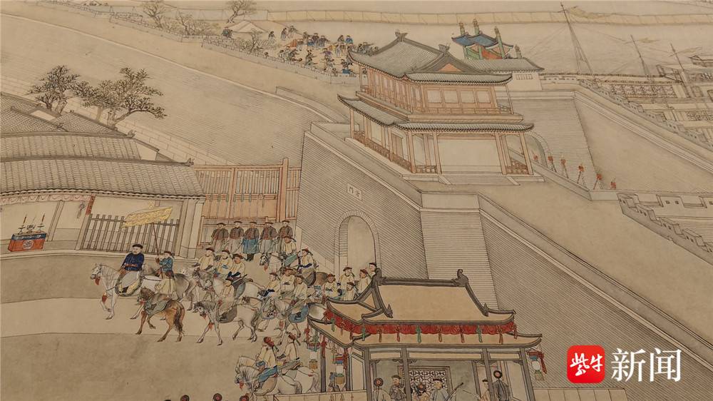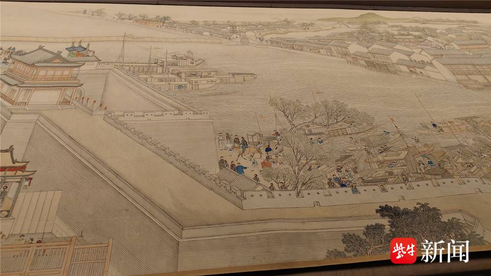 “《驻跸姑苏》这一卷是以大运河为线索,由北向南徐徐展开。”苏州博物馆工作人员杨倩菲指着画卷向记者介绍。顺着她的指引,记者的目光沿运河一路南下,经过浒墅关时仿佛听见了运河上的船工号子,掠过枫桥时似乎看见了泊岸的舟楫,再往前,虎丘塔影、阊门城楼、万年桥、胥门渐次映入眼帘,直至苏州织造府。画卷分段连续,一气呵成,每一段都人烟稠密、商肆林立,把一个繁华鼎盛的苏州城摊开在眼前。