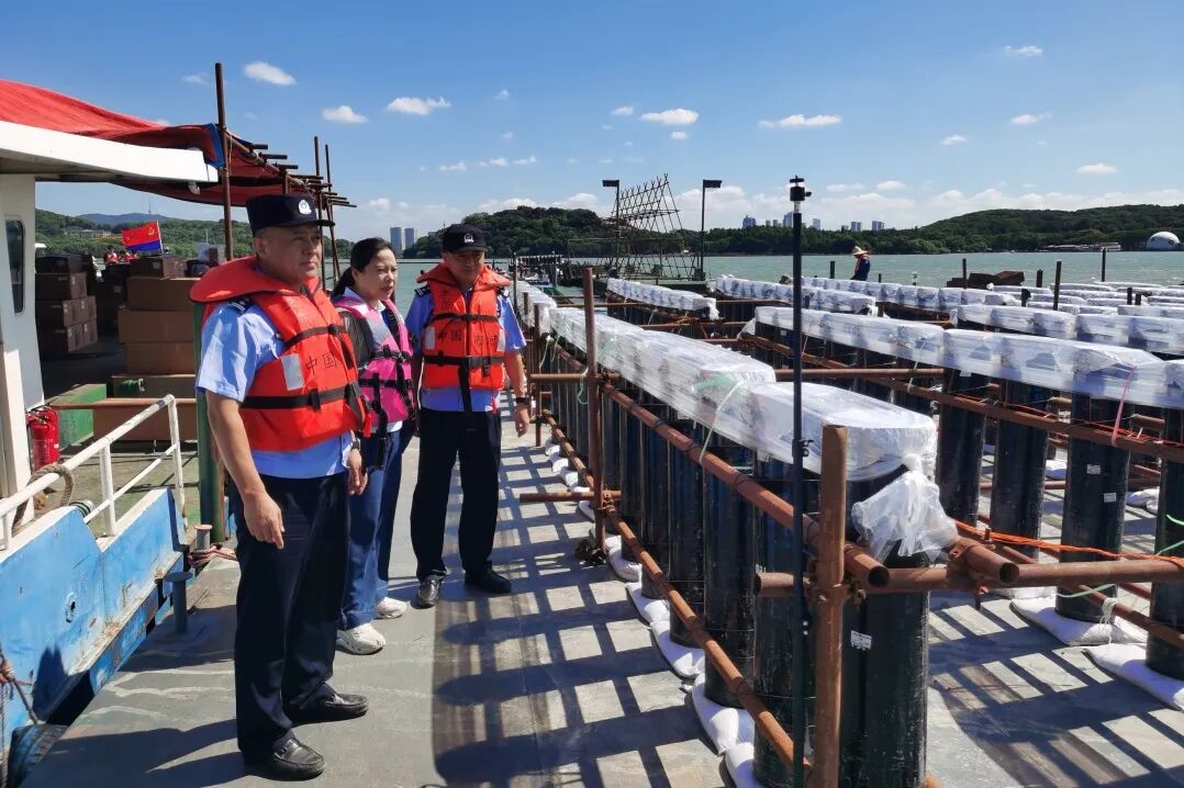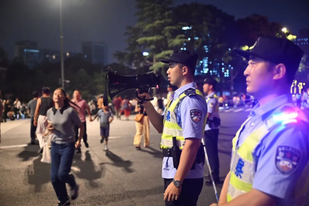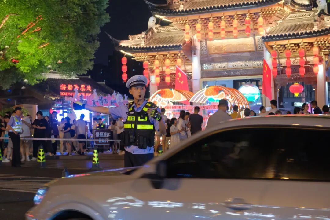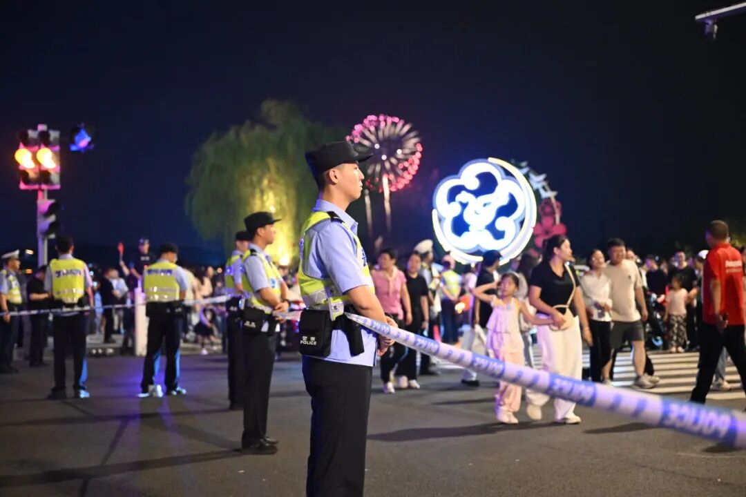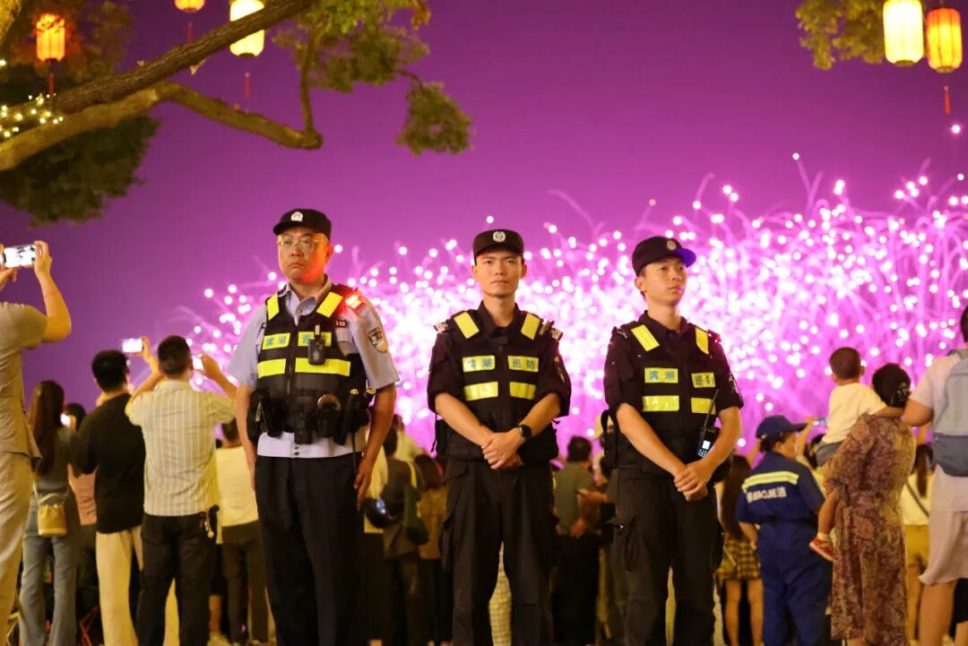 烟花背后,守护无声。市公安局治安支队对烟花运输存储、手续核验、驳载进场、平台安装、燃放作业、现场清理等关键环节实施全流程安全监管,驻警实时监控烟花燃放进度,针对水面作业平台特殊性,对作业人员资质、相关防护设施等情况进行多轮实地核查。市水上公安局在沿湖水域增设救生圈、快艇等救援设施,及时处置各类涉水警情,保障游客安全。