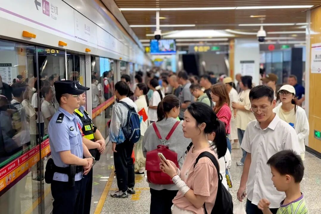 “地铁进站,请大家不要拥挤,有序乘坐!”国庆首日,市公共交通公安局盛岸站派出所在惠山古镇站加大巡逻警力投入,动态调整巡逻频次,在站厅、站台及进出口等重点区域加强值守,高效开展客流引导及秩序维护。苏南硕放国际机场公安局联合武警、安检等部门开展编队巡逻,及时解答旅客咨询、提供暖心服务。