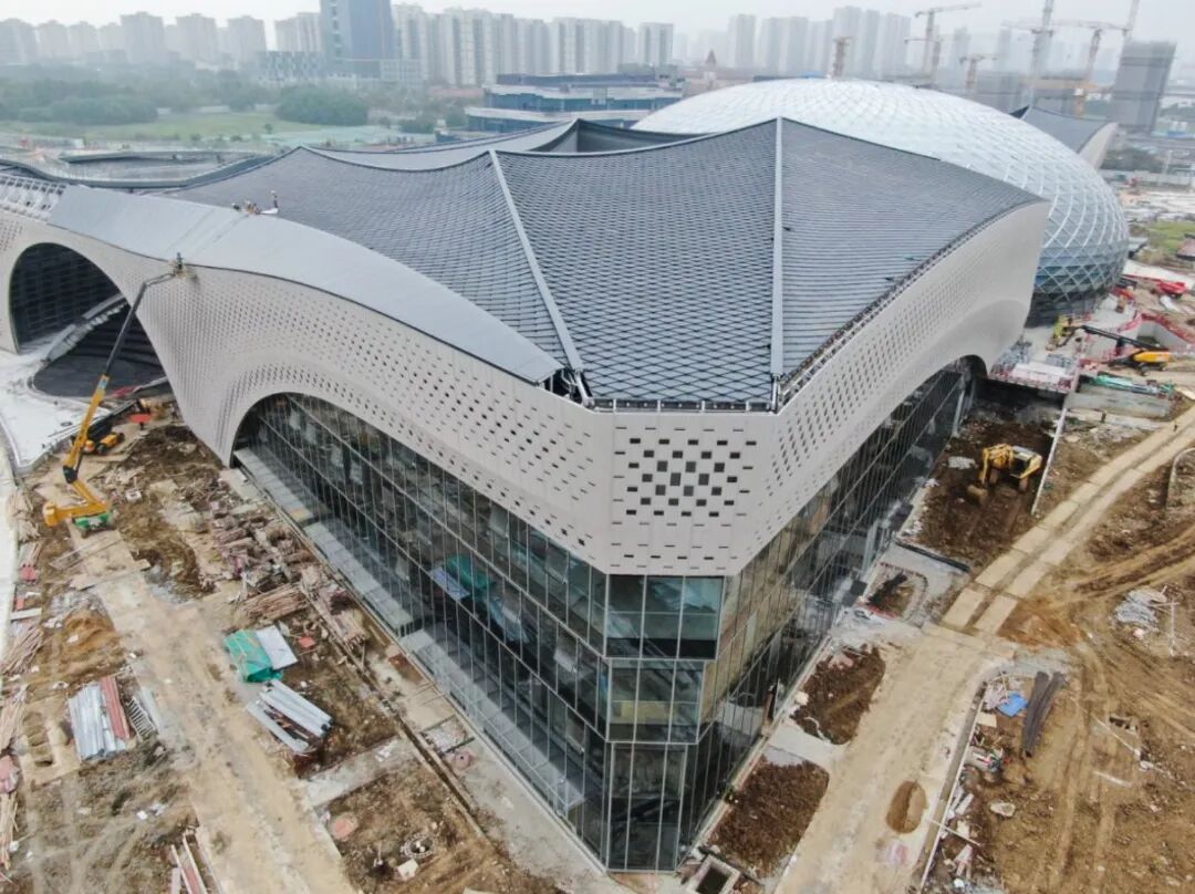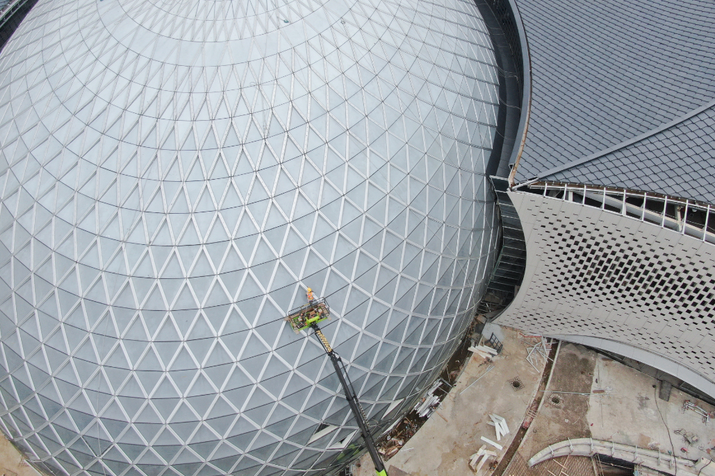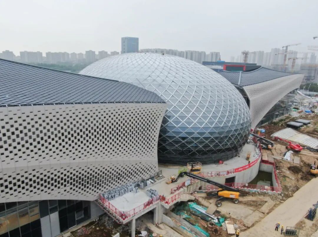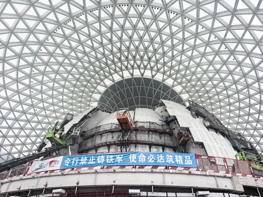 “从今年元旦音乐厅的主厅开始施工以来,项目施工团队加班加点抢工期,春节、五一等节假日期间都没有停歇,尤其是进入夏季,工人们冒着炎炎烈日施工作业,铝合金网壳结构已提前2个月封顶。”