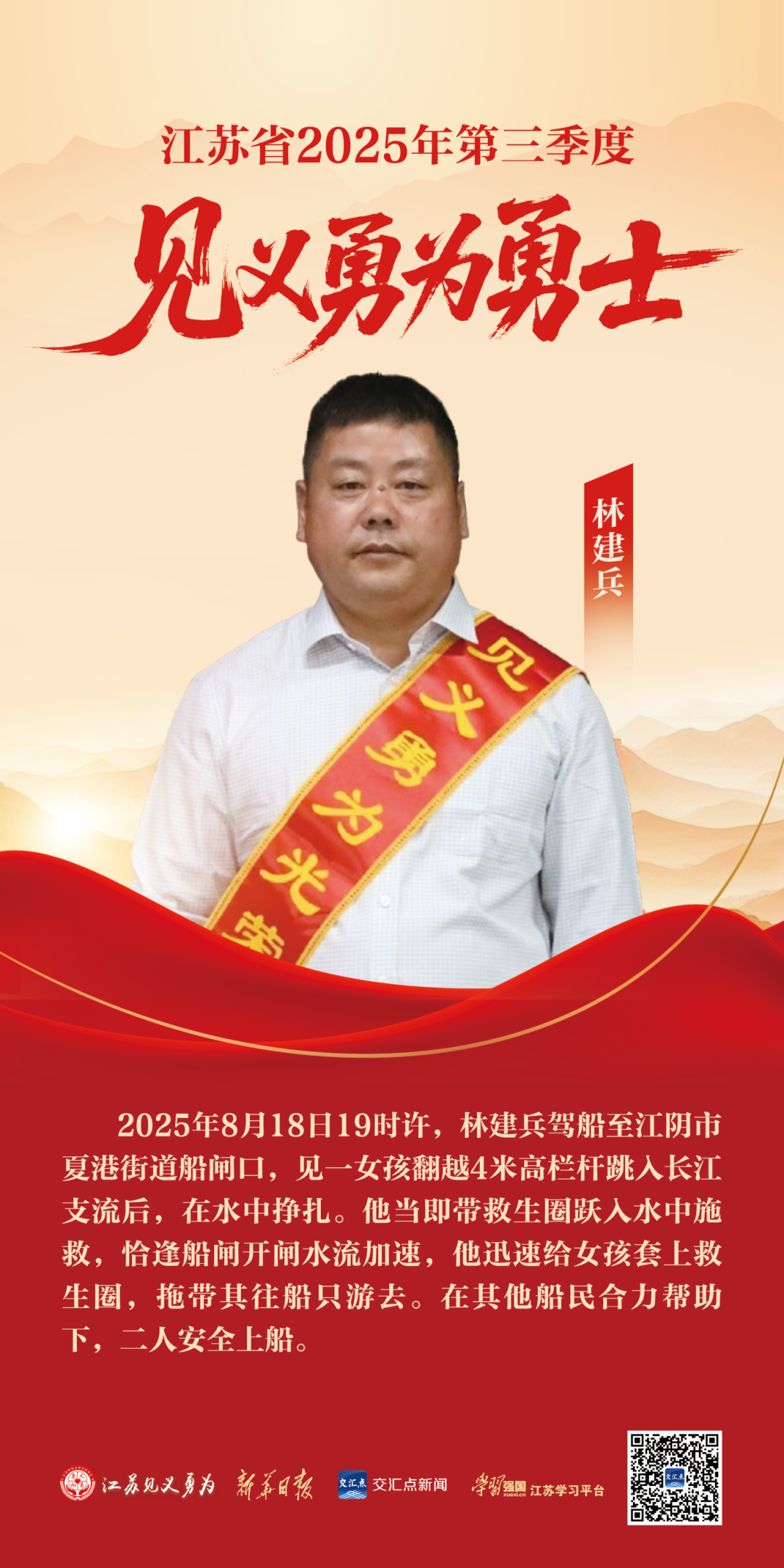 凡人善举,人间大爱。10月9日,江苏省见义勇为基金会发布2025年第三季度“省见义勇为勇士榜”。共有12位见义勇为人员光荣上榜,无锡市推荐的危急时刻勇救落水群众的船员林建兵光荣上榜。