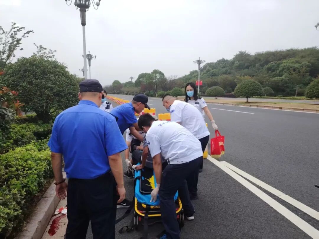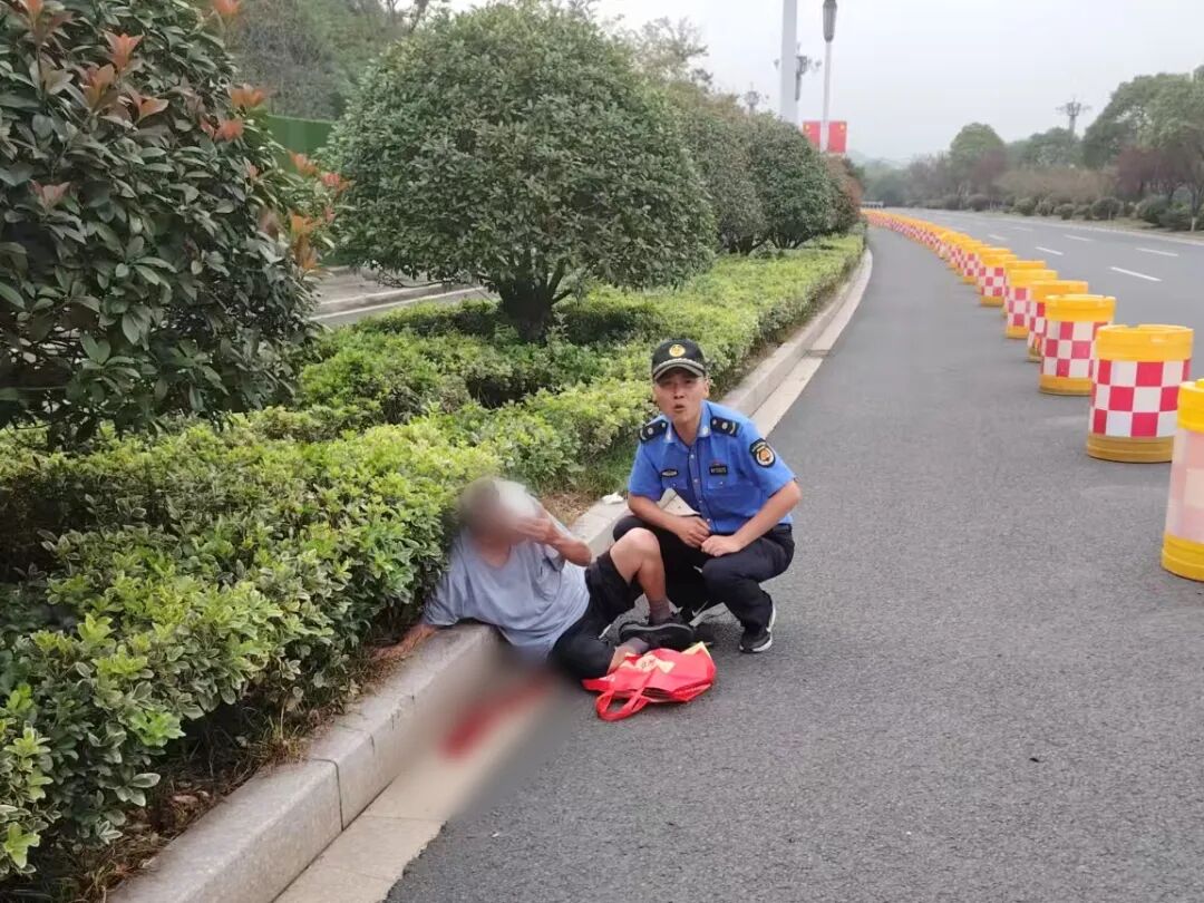 9月25日,城南中队高铁分队叶卓青、曹明、赵辉在巡查高铁站前大道时,发现一名老人不慎跌倒,致使头部撞破流血。几位队员迅速报警并呼叫120急救,守护在老人身旁,直至老人安全登上救护车。