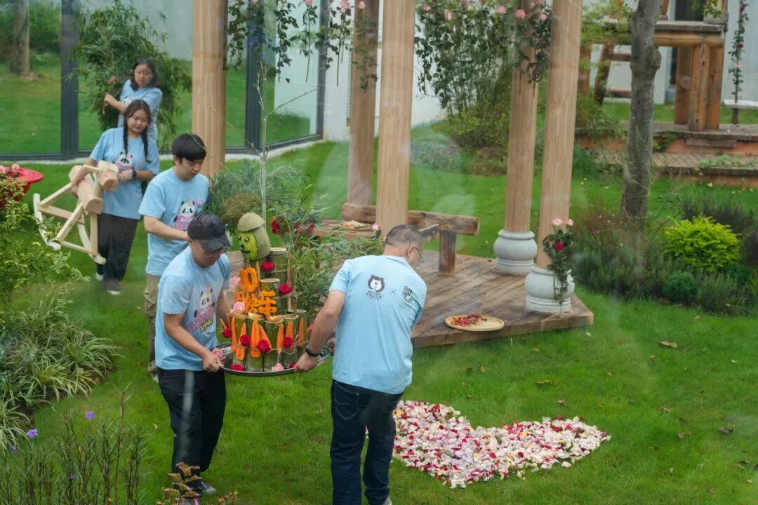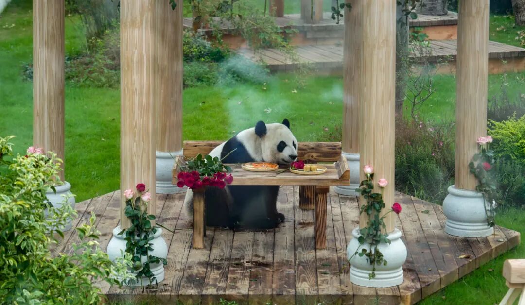 “庆生”现场主打“公主浪漫风”,外场的转碗、悦然亭、新玩具小木马前以及内场区域都被红粉相间的玫瑰花装扮一新,加悦悦用爪子拨楞悬挂着的玫瑰花的画面引得快门声无数。