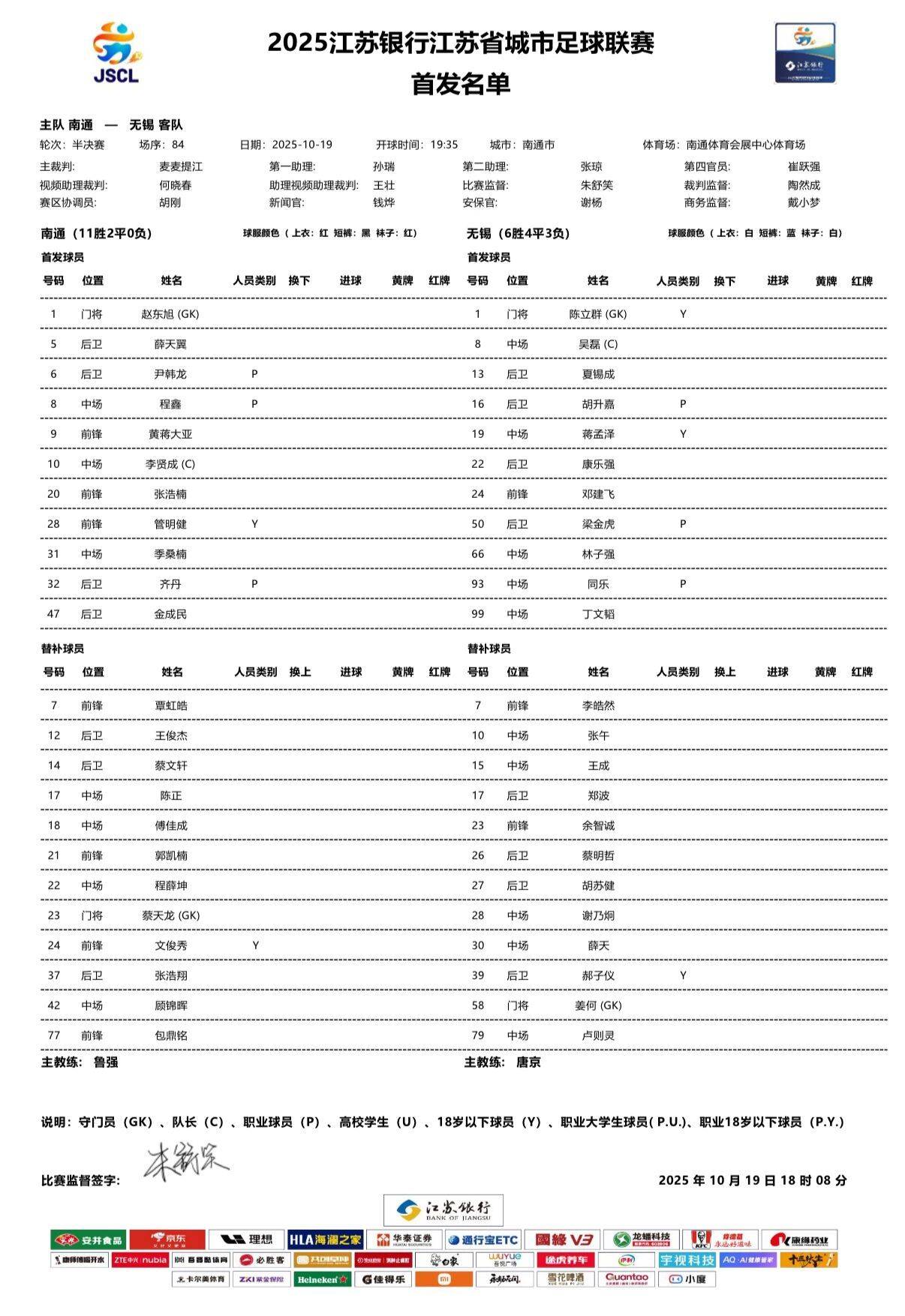 战鼓擂响,大战一触即发!今晚,“苏超”半决赛无锡队客场迎战南通队,刚刚首发阵容出炉↓